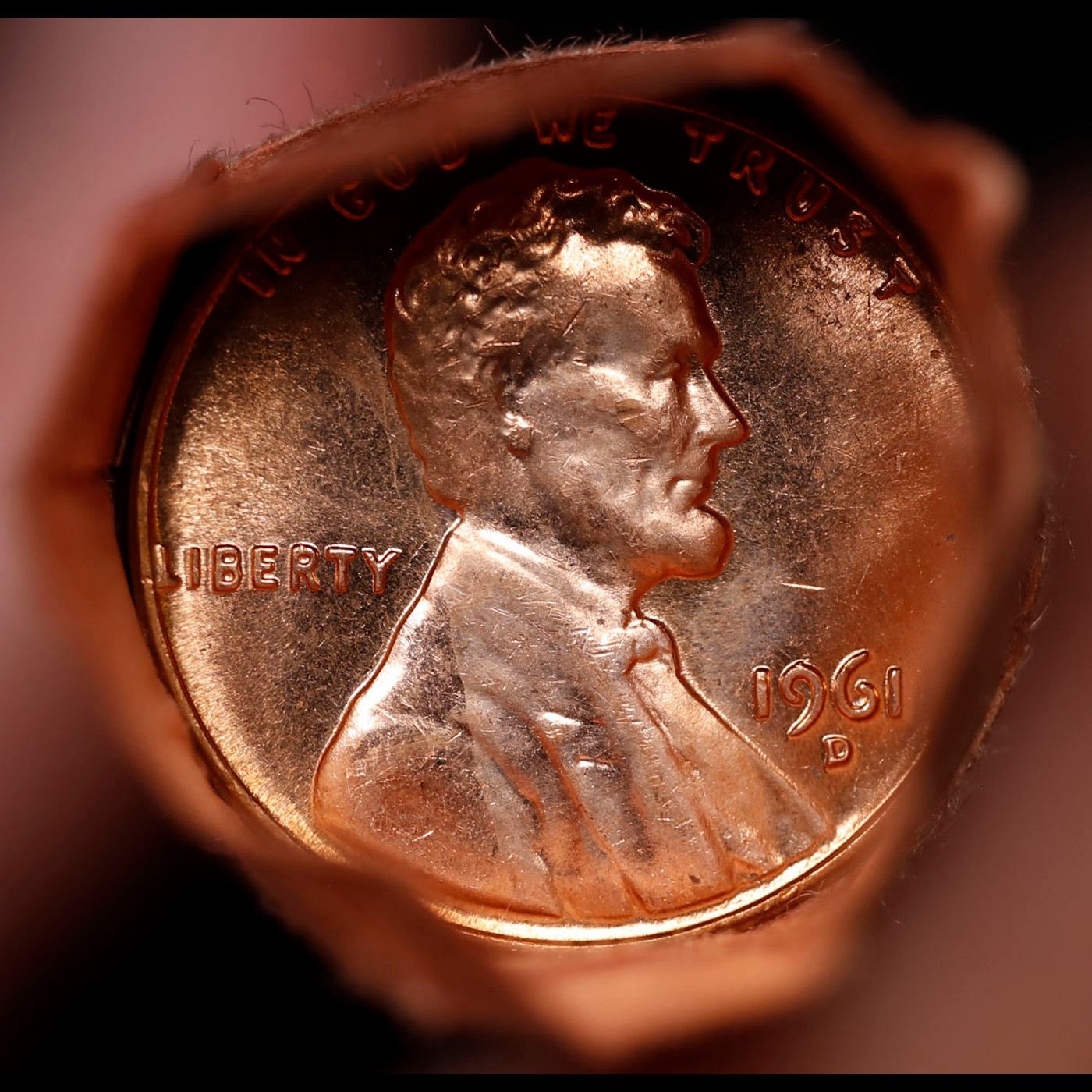 Shotgun Lincoln 1c roll, 1961-d 50 pcs Brandt Wrapper.. A terrific Shotgun roll of Lincoln cents. Most if not all coin should be cherry red.