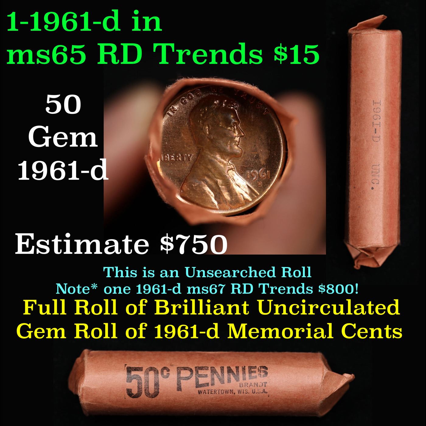 Shotgun Lincoln 1c roll, 1961-d 50 pcs Brandt Wrapper.. A terrific Shotgun roll of Lincoln cents. Most if not all coin should be cherry red.