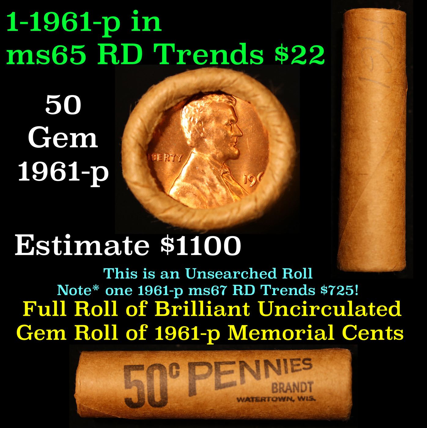 Shotgun Lincoln 1c roll, 1961-p 50 pcs Brandt Wrapper .
