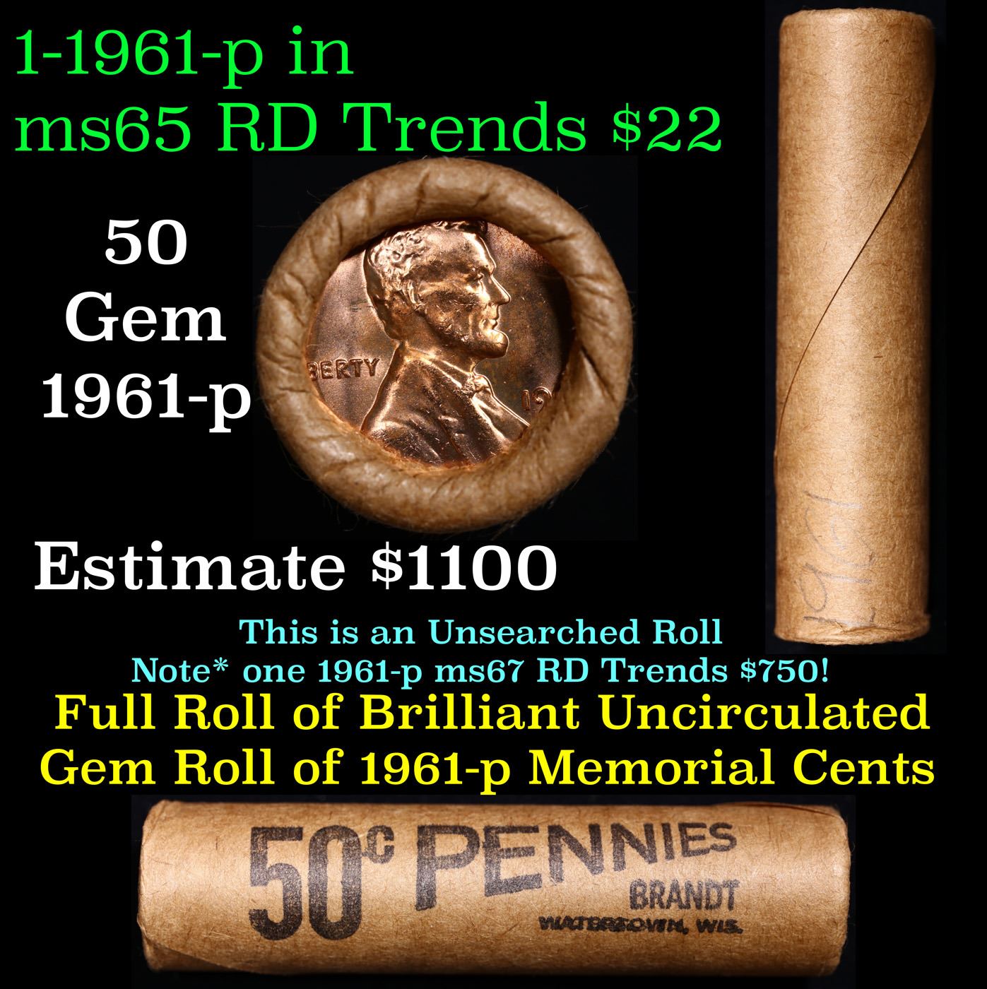 Shotgun Lincoln 1c roll, 1961-p 50 pcs Brandt Wrapper .