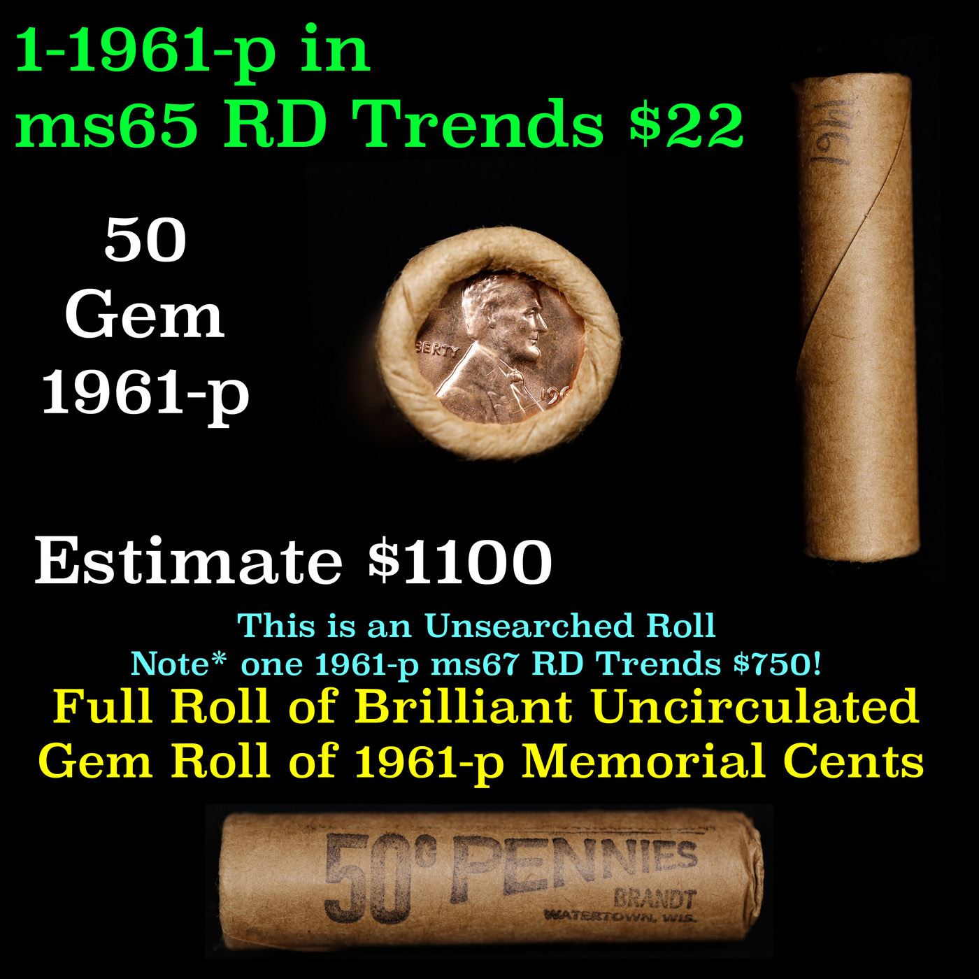 Shotgun Lincoln 1c roll, 1961-p 50 pcs Brandt Wrapper.. A terrific Shotgun roll of Lincoln cents. Most if not all coin should be cherry red.