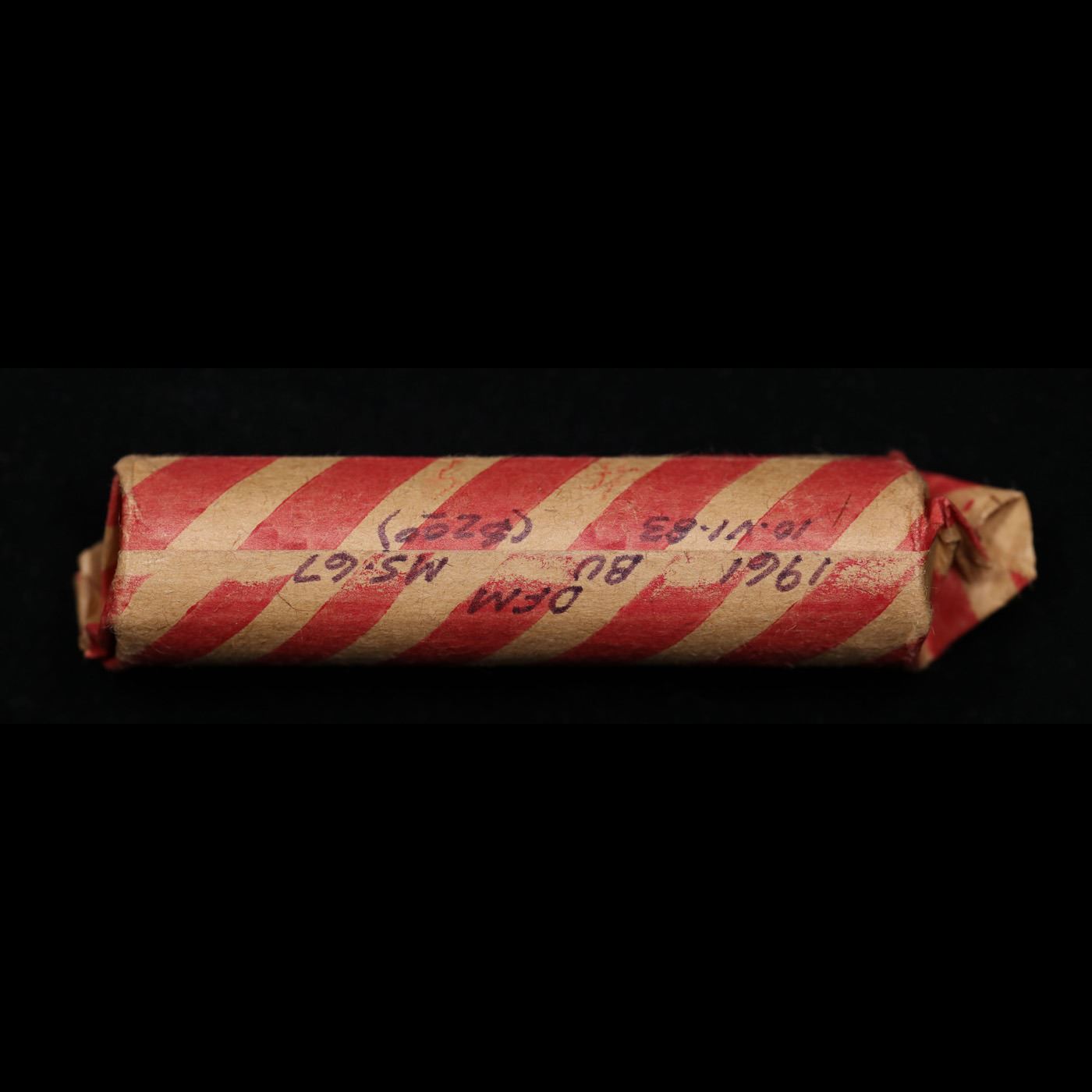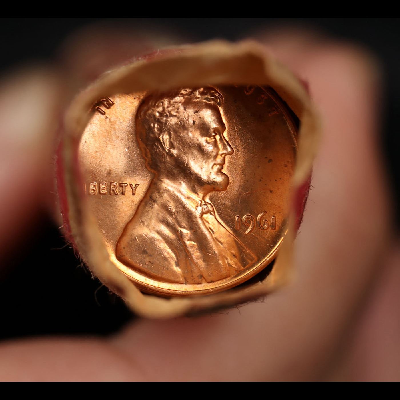 Shotgun Lincoln 1c roll, 1961-p 50 pcs Pennies Wrapper.. A terrific Shotgun roll of Lincoln cents. Most if not all coin should be cherry red.