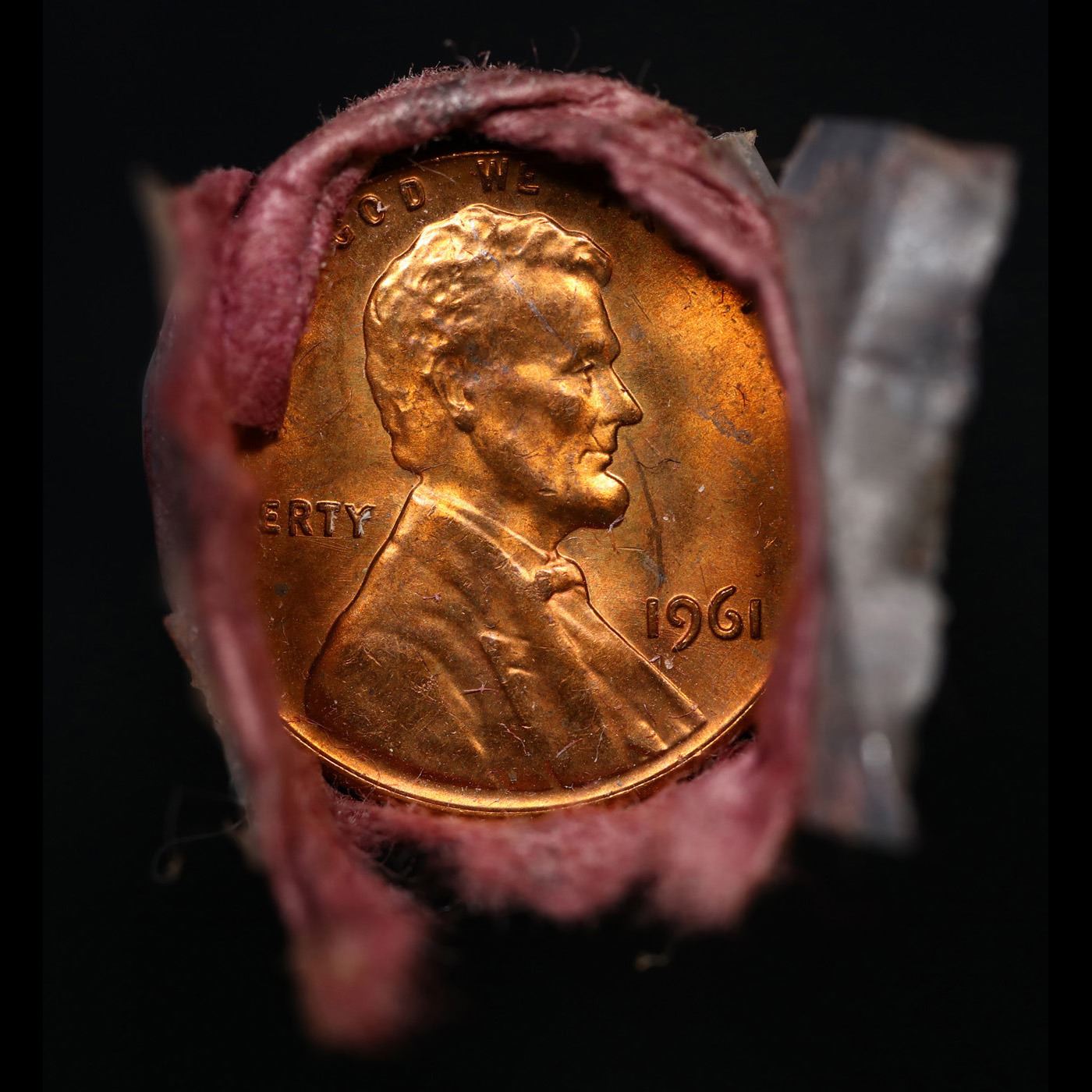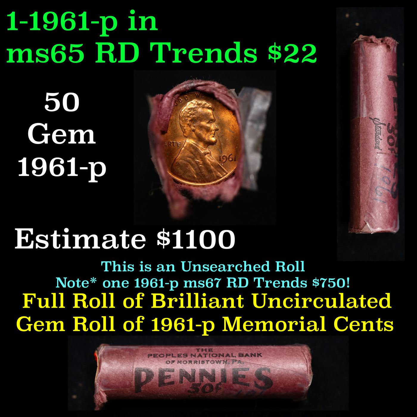 Shotgun Lincoln 1c roll, 1961-p 50 pcs Peoples National Bank Wrapper.. A terrific Shotgun roll of Lincoln cents. Most if not all coin should be cherry red.