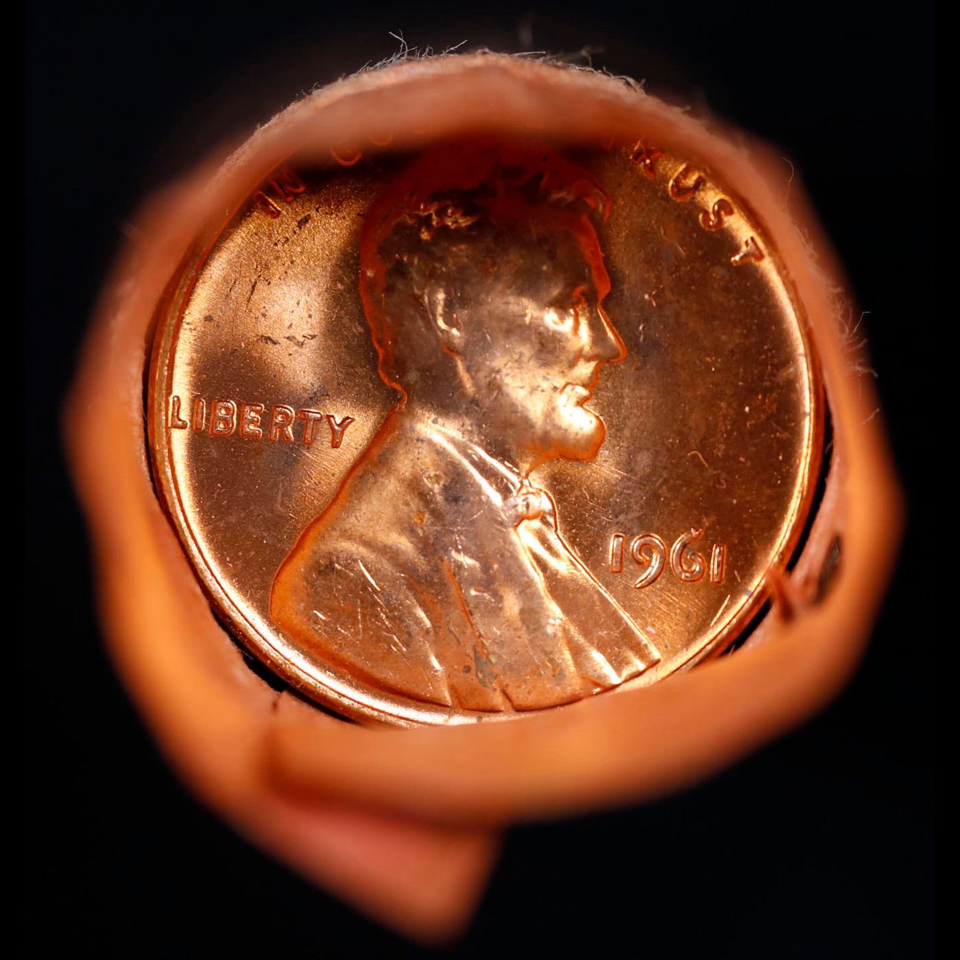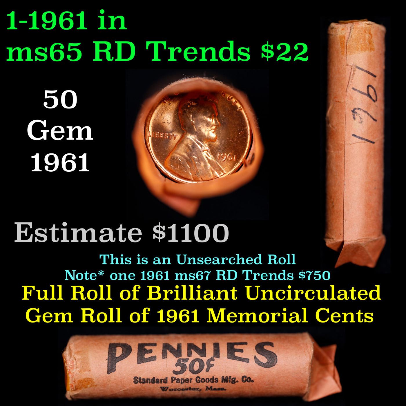 Shotgun Lincoln 1c roll, 1961-p 50 pcs Standard Paper Goods Mfg. Co. Wrapper . A terrific Shotgun roll of Lincoln cents. All coins appear to be cherry red. Trends ms65 rd $20