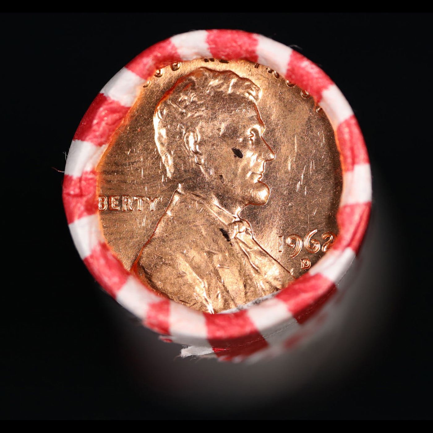 Shotgun Lincoln 1c roll, 1962-d 50 pcs Bank Wrapper.. A terrific Shotgun roll of Lincoln cents. Most if not all coin should be cherry red.
