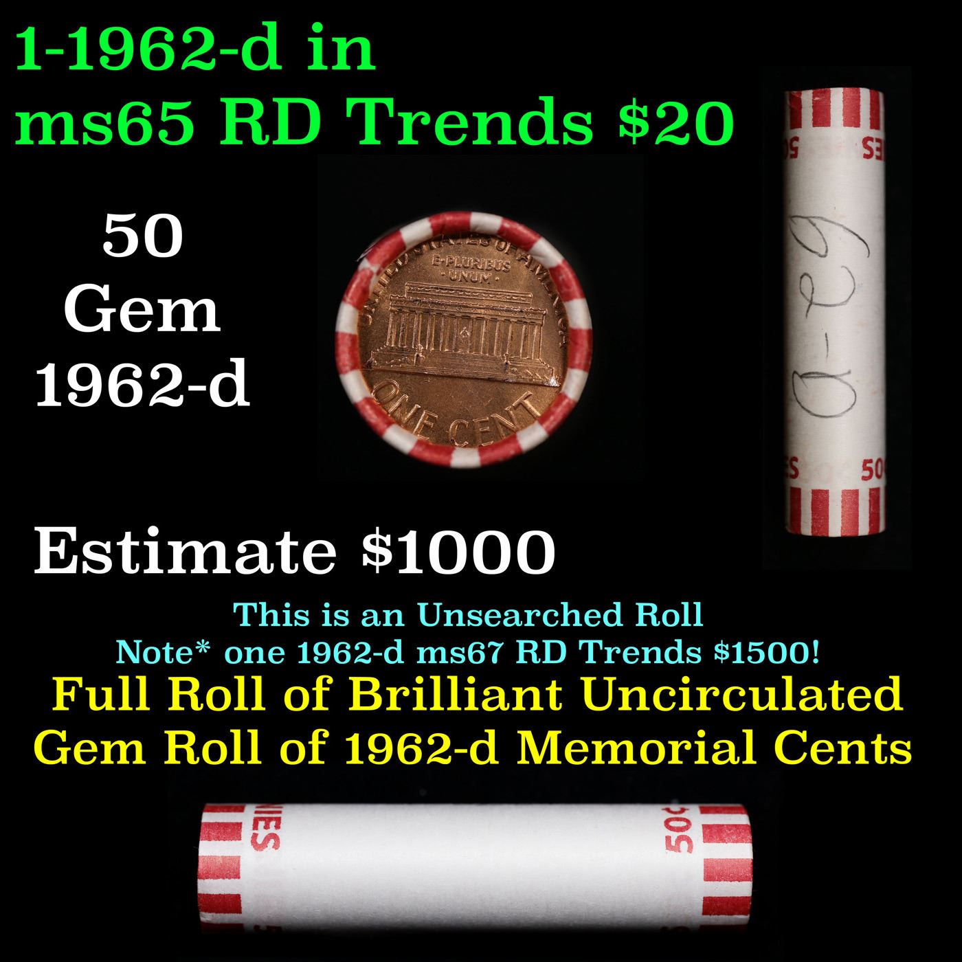 Shotgun Lincoln 1c roll, 1962-d 50 pcs Bank Wrapper.. A terrific Shotgun roll of Lincoln cents. Most if not all coin should be cherry red.