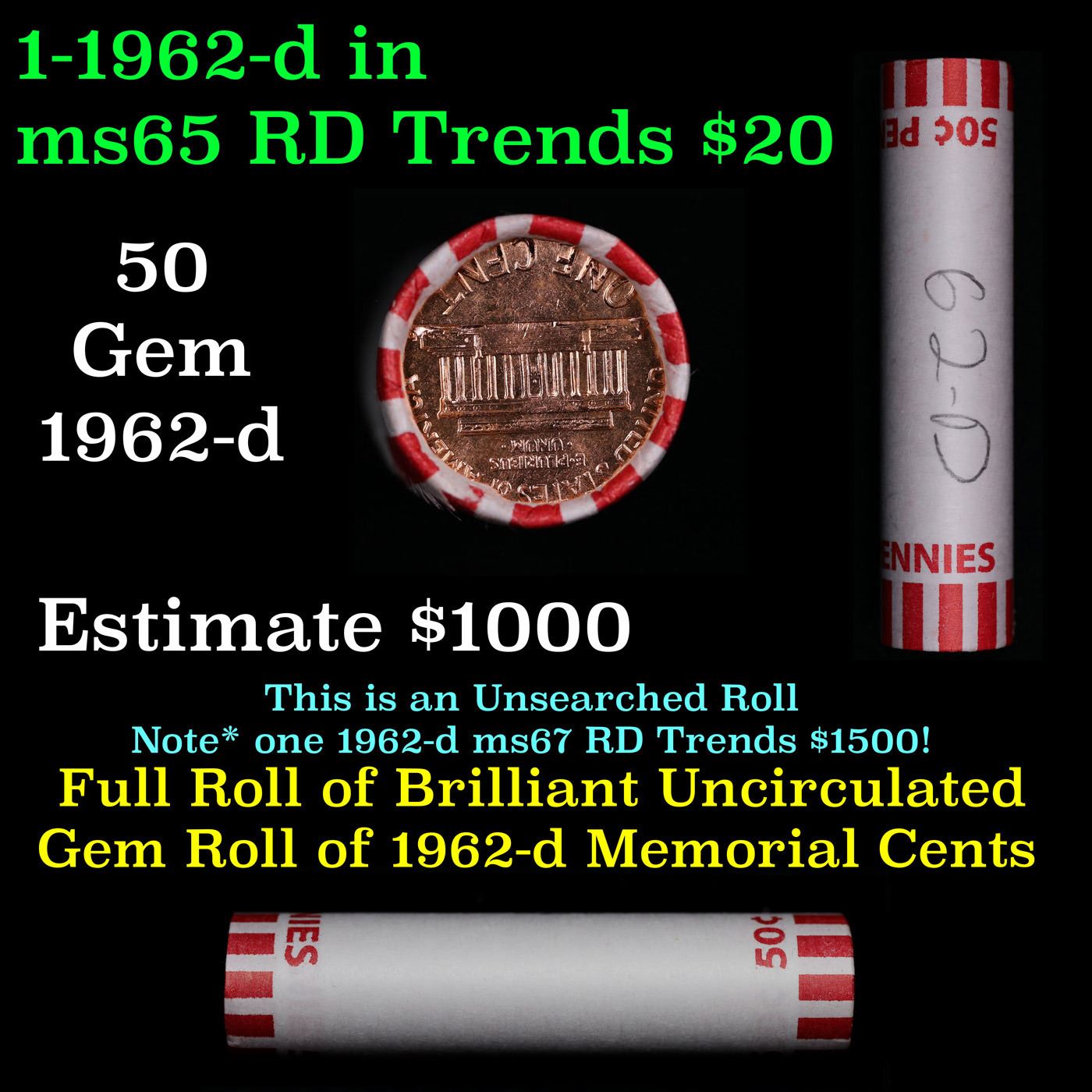 Shotgun Lincoln 1c roll, 1962-d 50 pcs Bank Wrapper.. A terrific Shotgun roll of Lincoln cents. Most if not all coin should be cherry red.