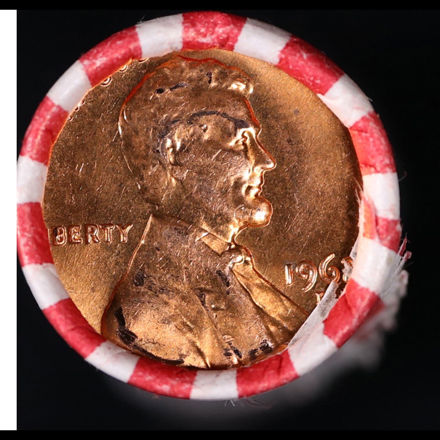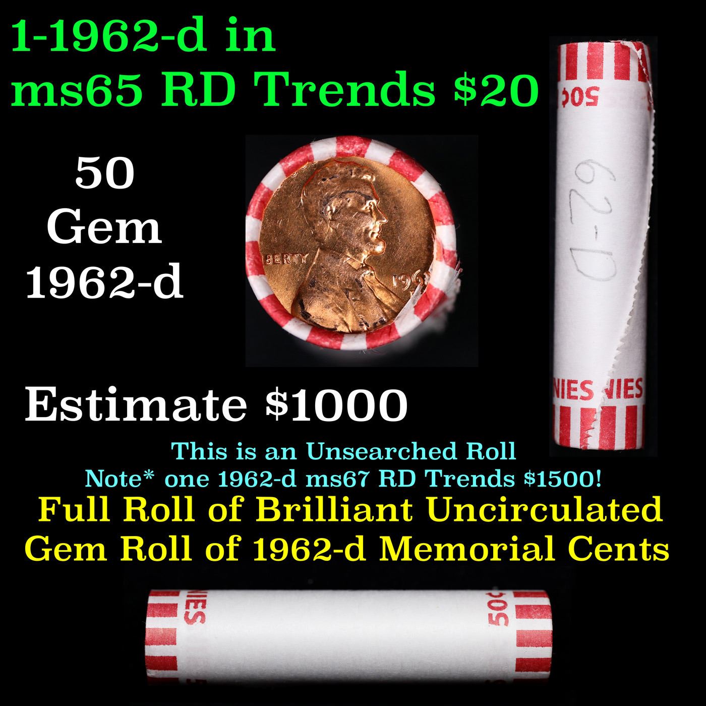 Shotgun Lincoln 1c roll, 1962-d 50 pcs Bank Wrapper.. A terrific Shotgun roll of Lincoln cents. Most if not all coin should be cherry red.