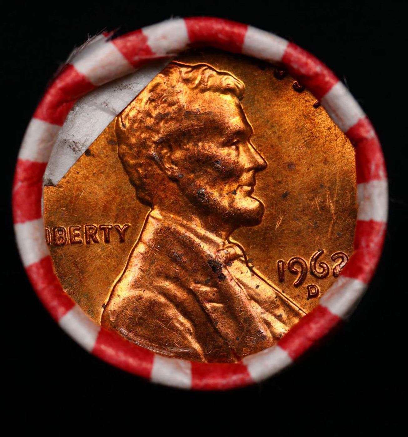 Shotgun Lincoln 1c roll, 1962-d 50 pcs Bank Wrapper.. A terrific Shotgun roll of Lincoln cents. Most if not all coin should be cherry red.
