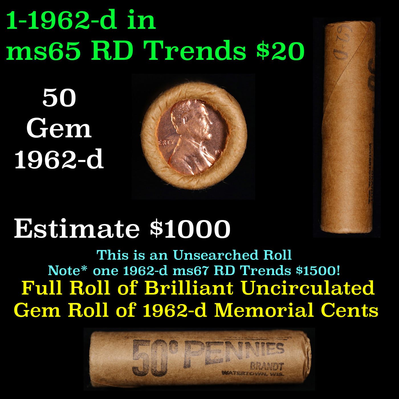Shotgun Lincoln 1c roll, 1962-d 50 pcs Brandt Wrapper.. A terrific Shotgun roll of Lincoln cents. Most if not all coin should be cherry red. Trends ms65 rd $20