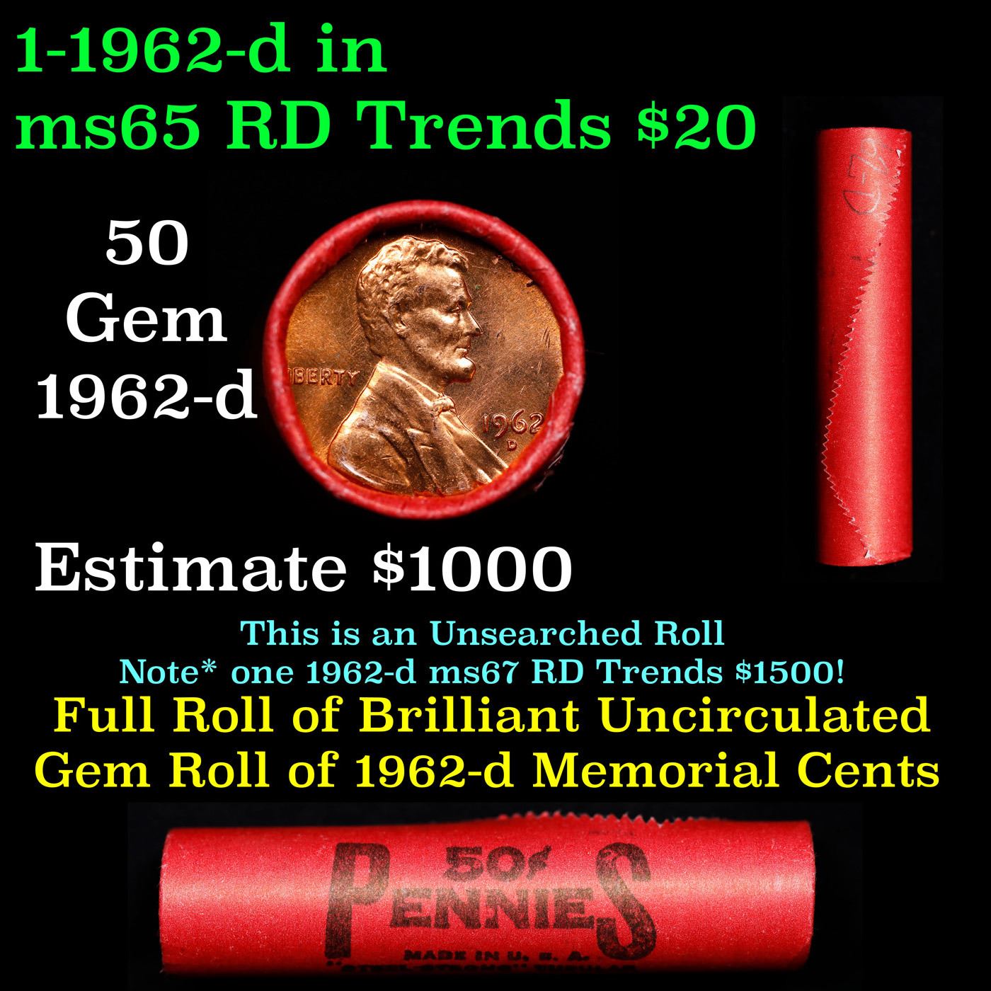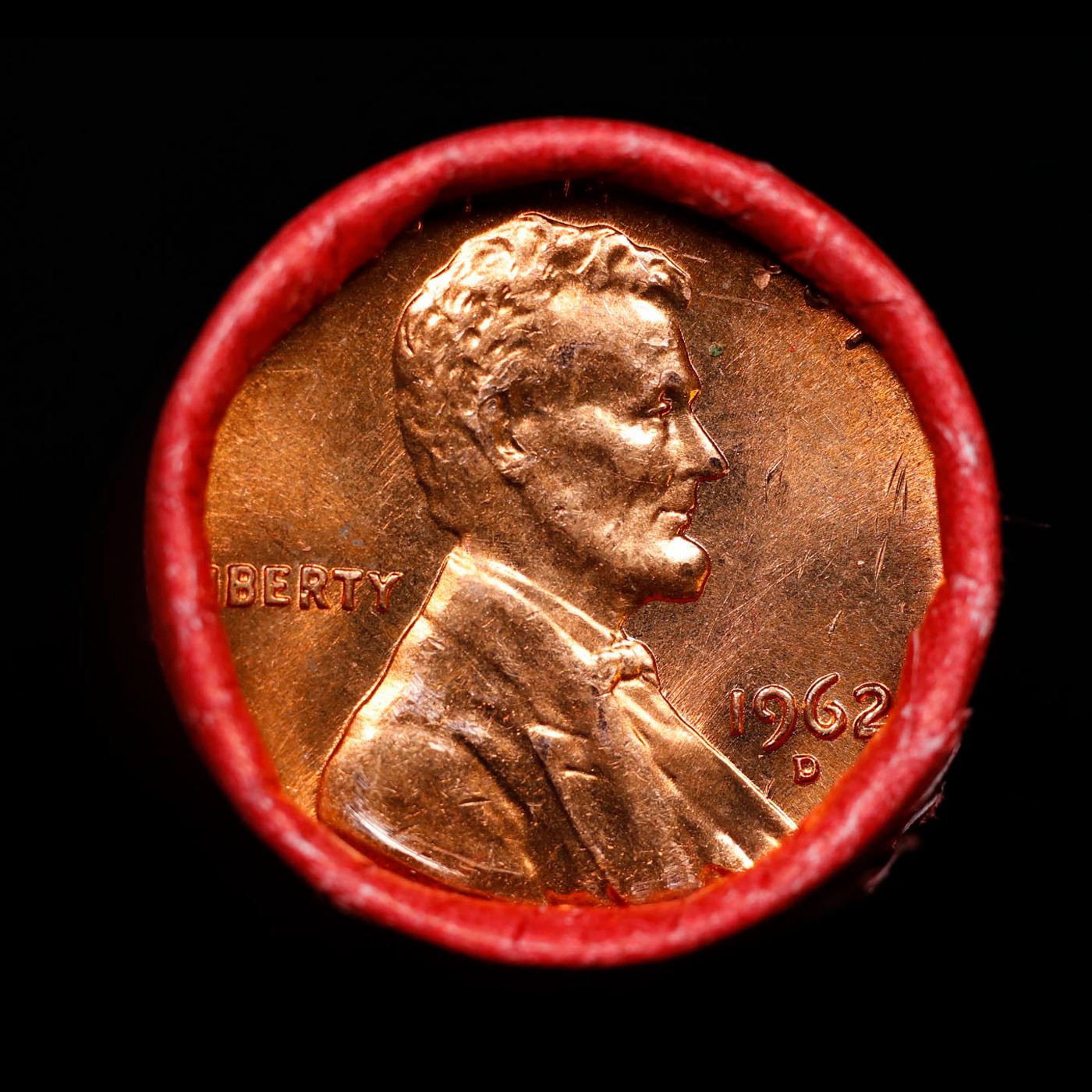 Shotgun Lincoln 1c roll, 1962-d 50 pcs Steel-Strong Wrapper.. A terrific Shotgun roll of Lincoln cents. Most if not all coin should be cherry red.