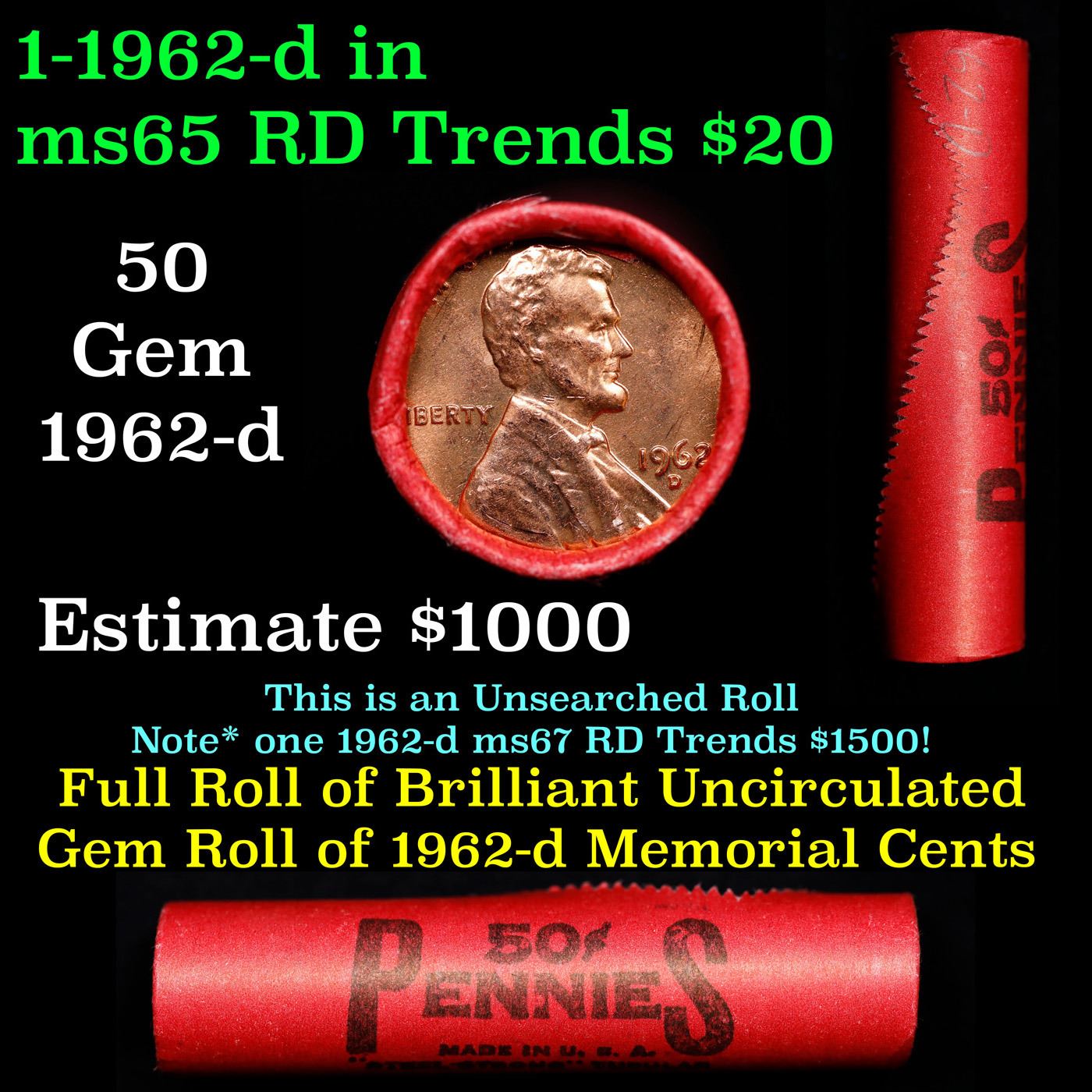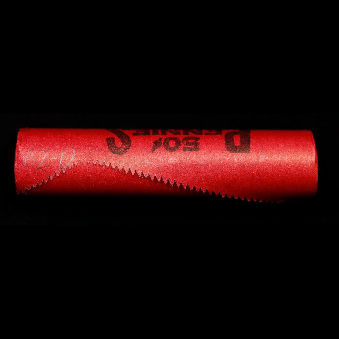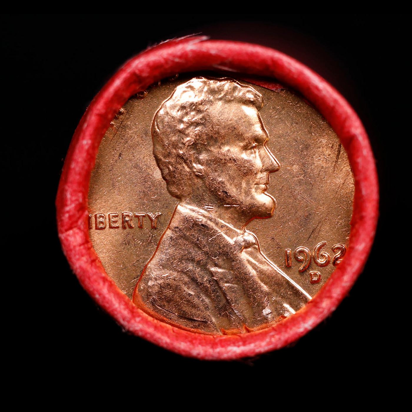 Shotgun Lincoln 1c roll, 1962-d 50 pcs Steel-Strong Wrapper.. A terrific Shotgun roll of Lincoln cents. Most if not all coin should be cherry red.