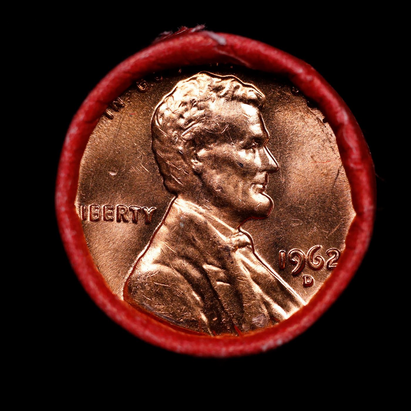 Shotgun Lincoln 1c roll, 1962-d 50 pcs Steel-Strong Wrapper.. A terrific Shotgun roll of Lincoln cents. Most if not all coin should be cherry red.