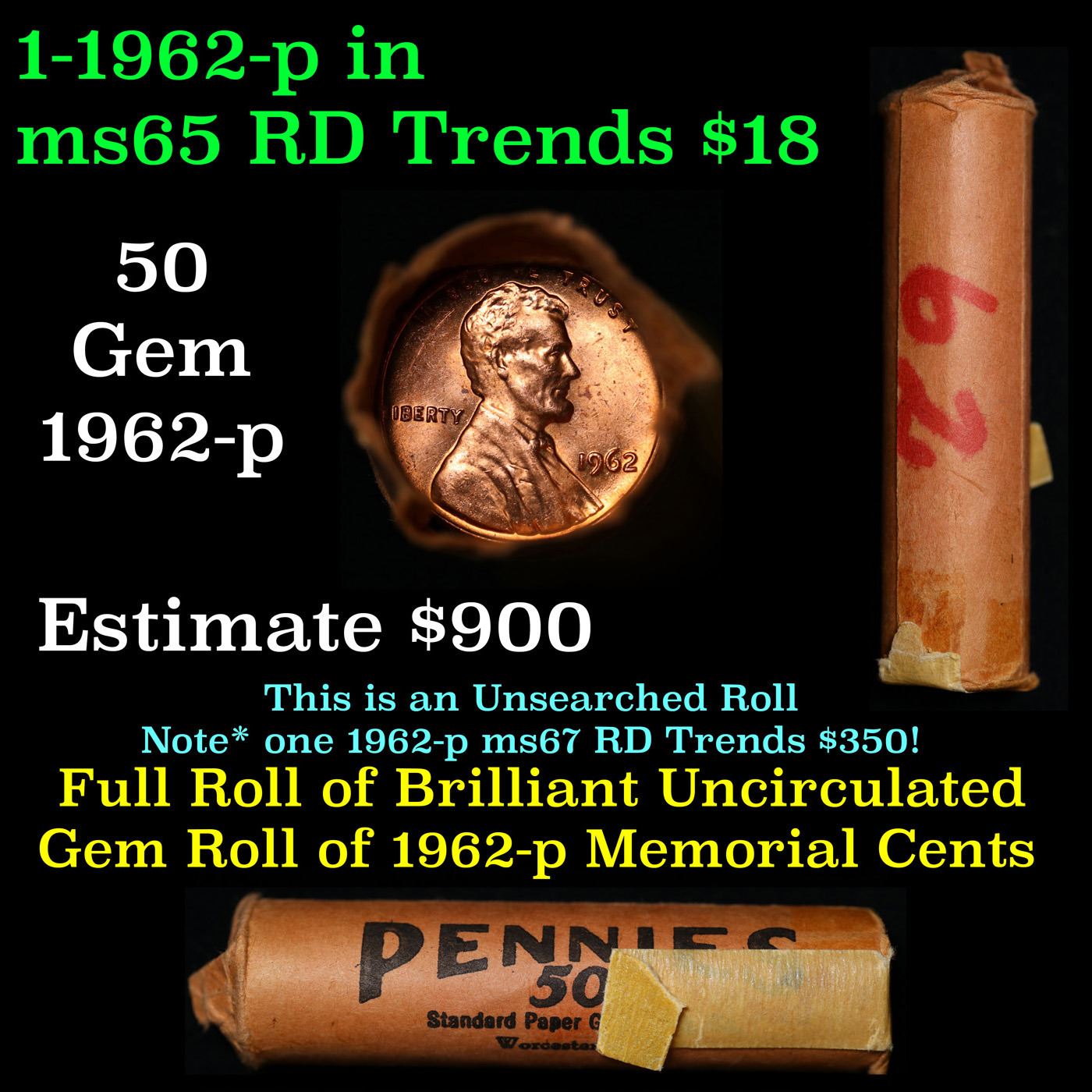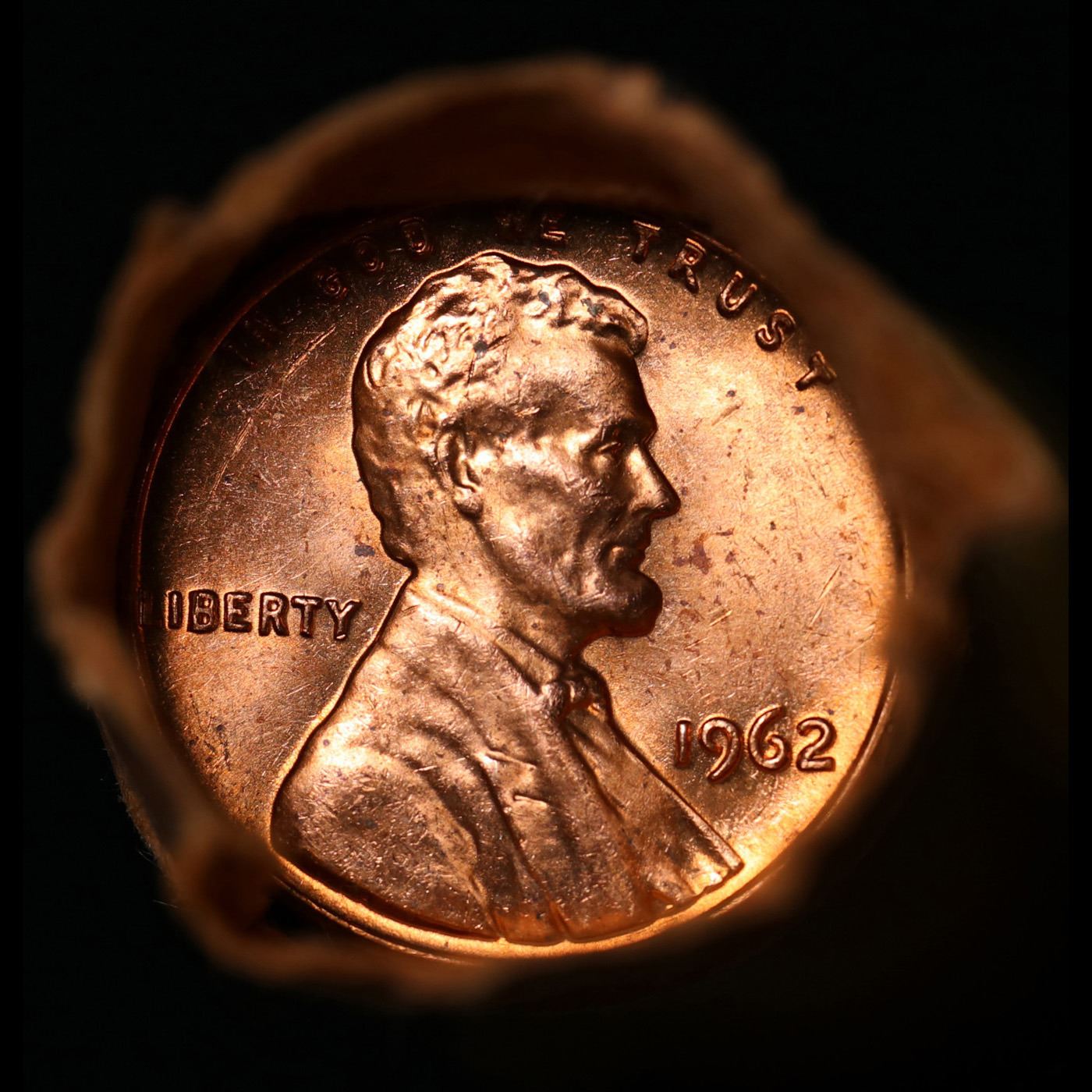 Shotgun Lincoln 1c roll, 1962-p 50 pcs Bank Wrapper.. A terrific Shotgun roll of Lincoln cents. Most if not all coin should be cherry red.