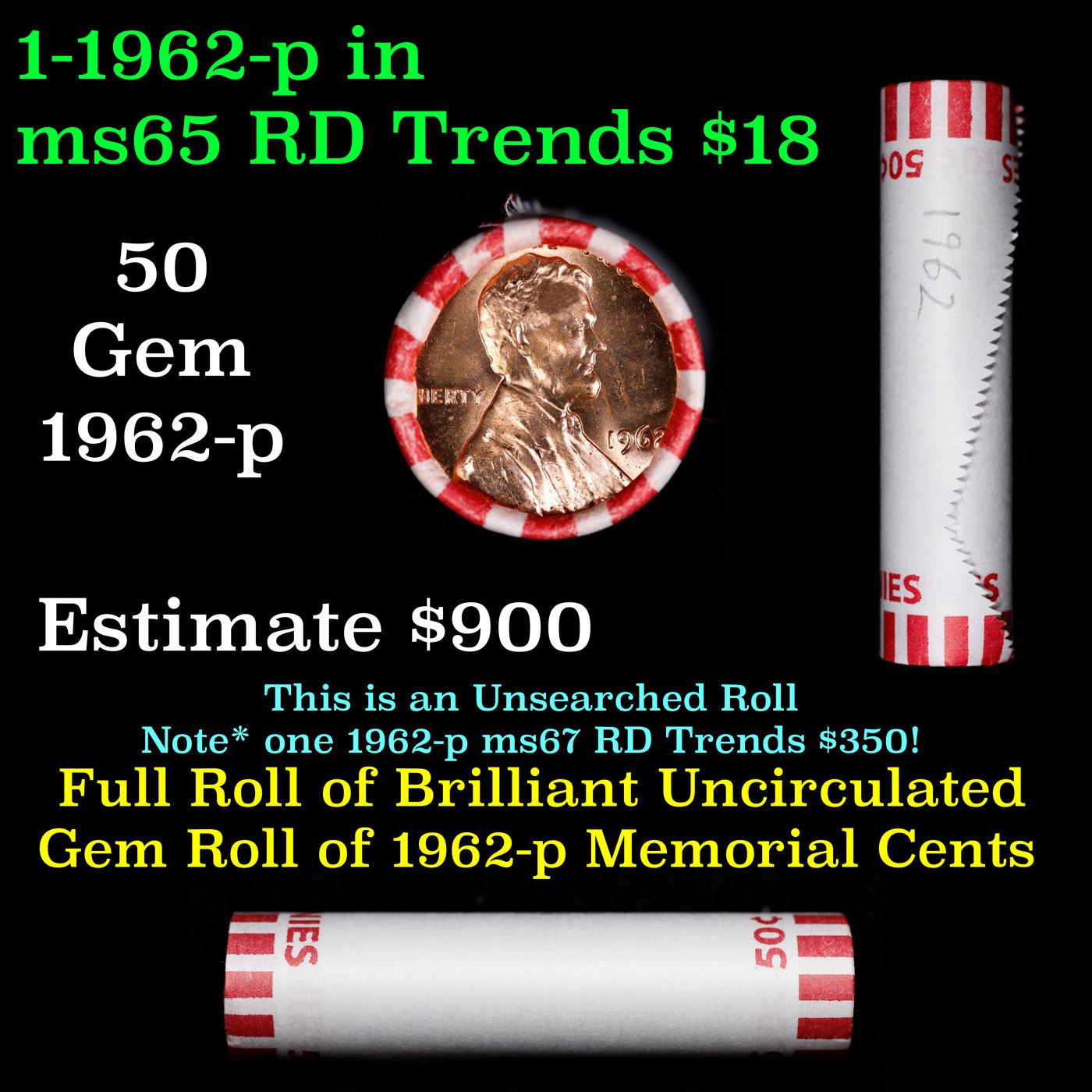 Shotgun Lincoln 1c roll, 1962-p 50 pcs Bank Wrapper.. A terrific Shotgun roll of Lincoln cents. Most if not all coin should be cherry red.