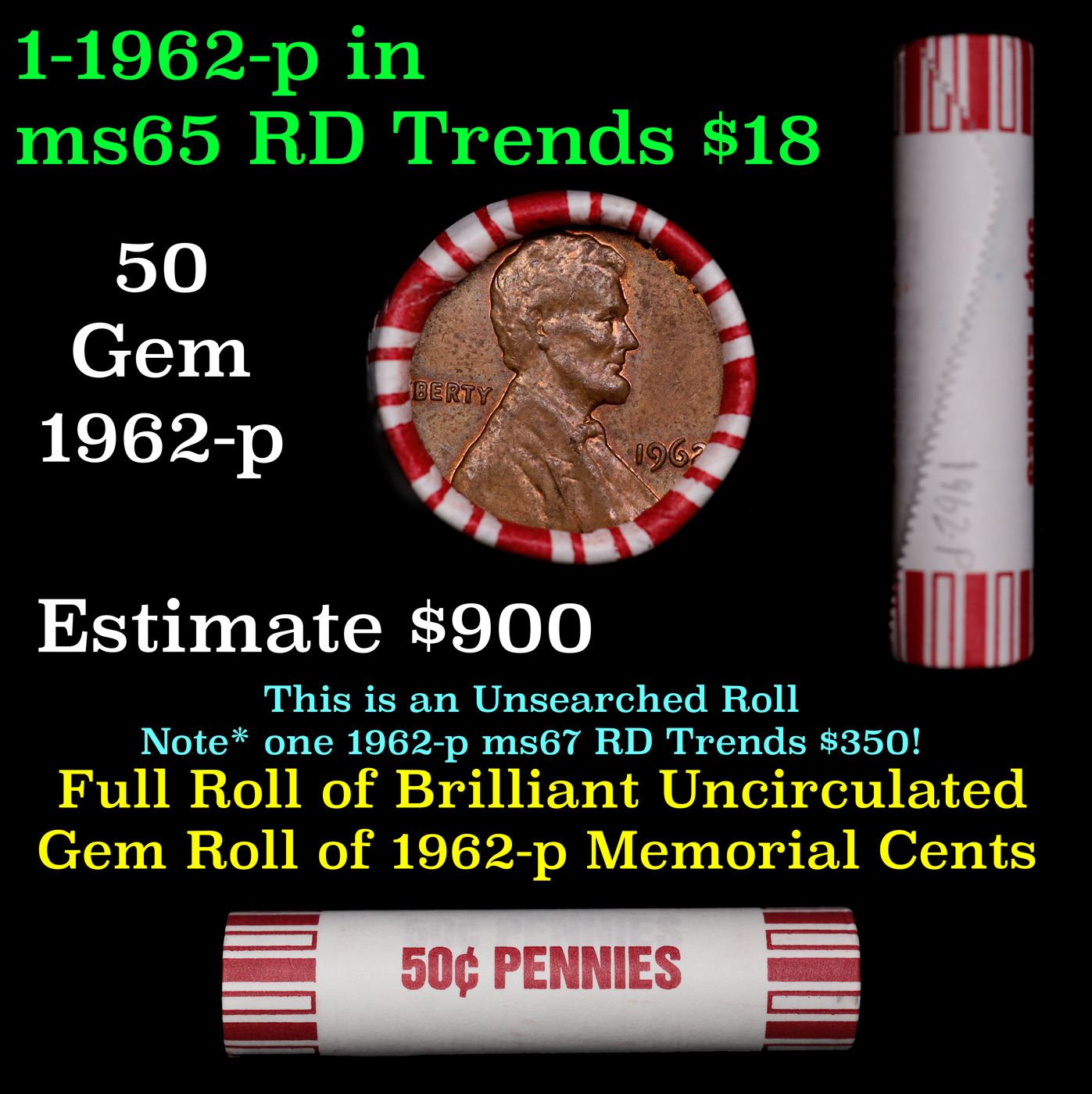 Shotgun Lincoln 1c roll, 1962-p 50 pcs Bank Wrapper. A terrific Shotgun roll of Lincoln cents. Most if not all coin should be cherry red.
