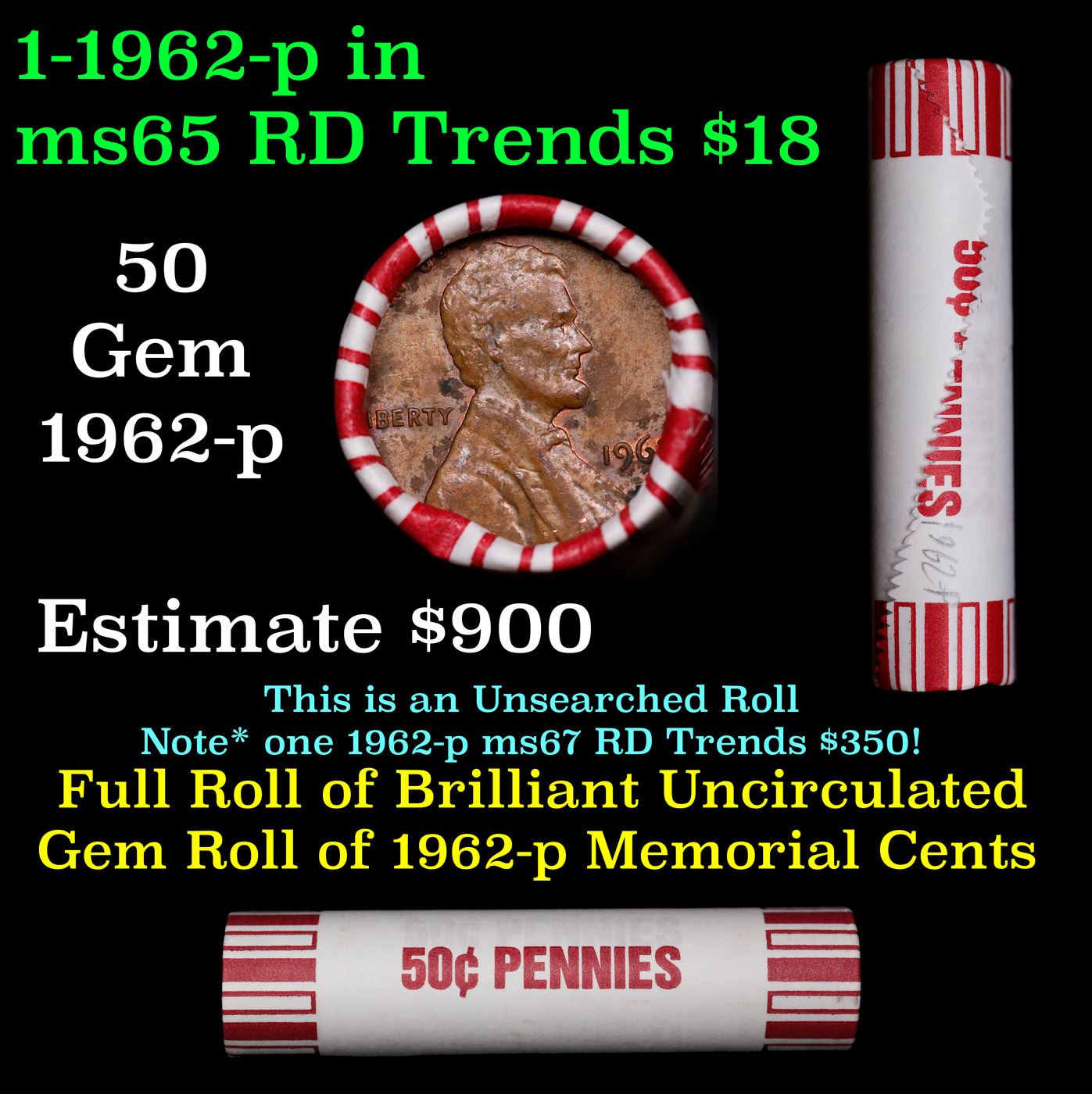 Shotgun Lincoln 1c roll, 1962-p 50 pcs Brandt 50c Wrapper.. A terrific Shotgun roll of Lincoln cents. Most if not all coin should be cherry red.