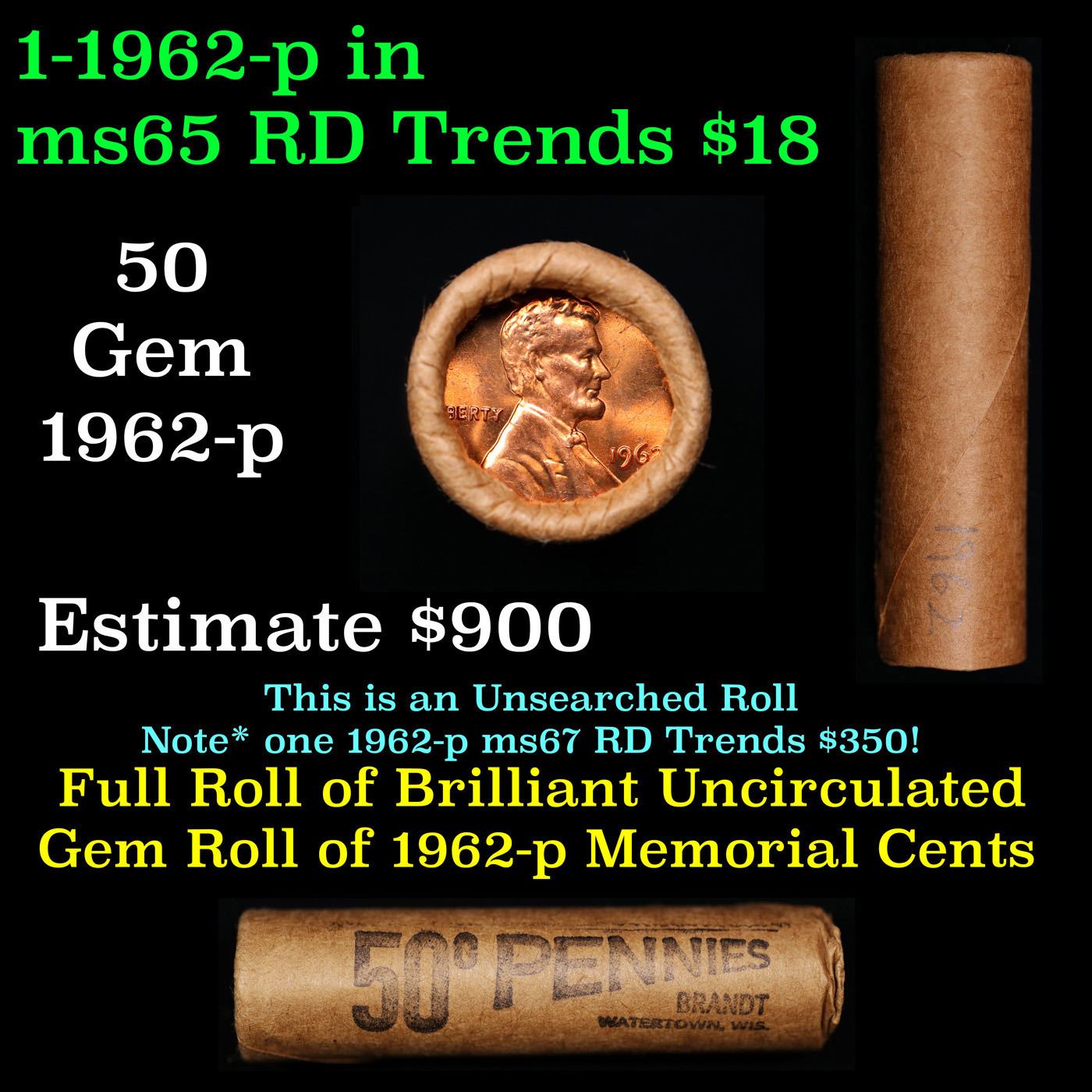 Shotgun Lincoln 1c roll, 1962-p 50 pcs Brandt Wrapper.. A terrific Shotgun roll of Lincoln cents. Most if not all coin should be cherry red. Trends ms65 rd $18