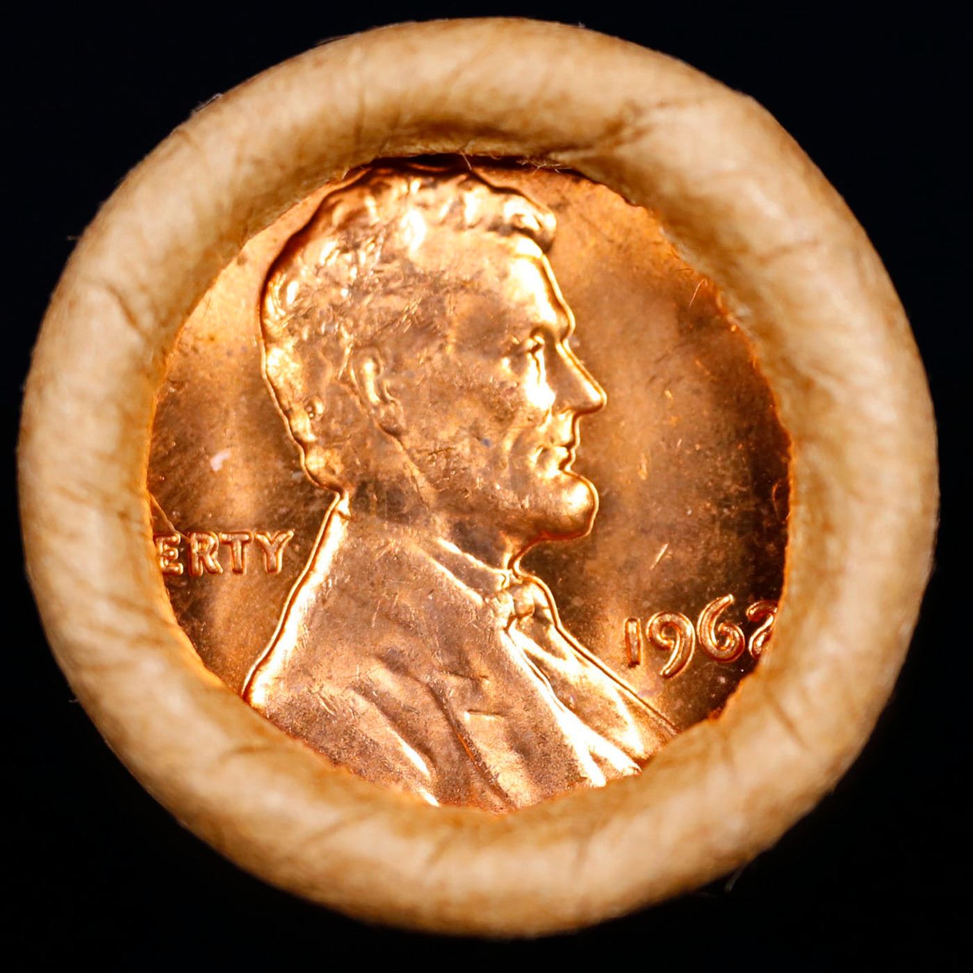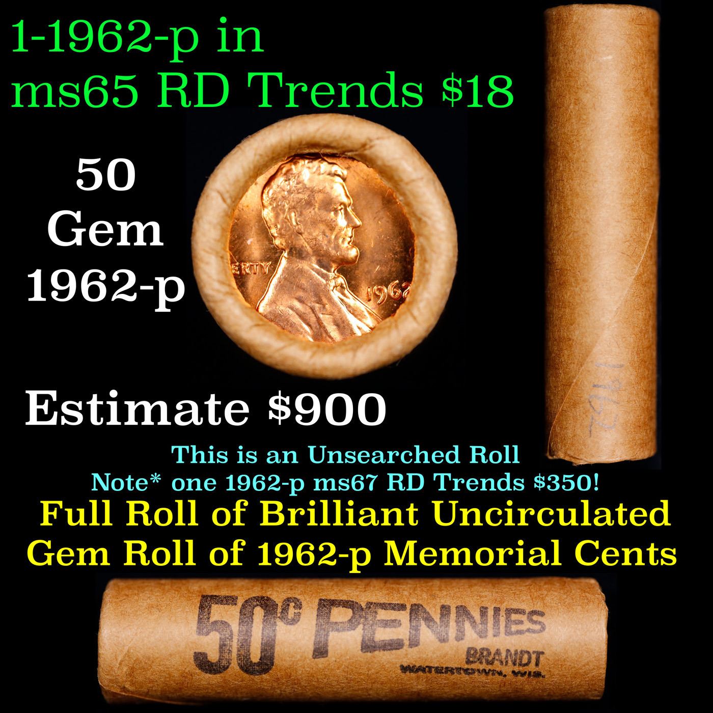 Shotgun Lincoln 1c roll, 1962-p 50 pcs Brandt Wrapper.. A terrific Shotgun roll of Lincoln cents. Most if not all coin should be cherry red. Trends ms65 rd $18