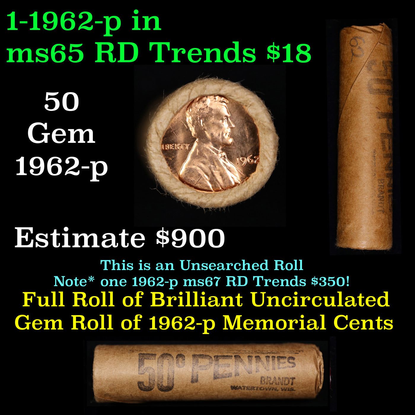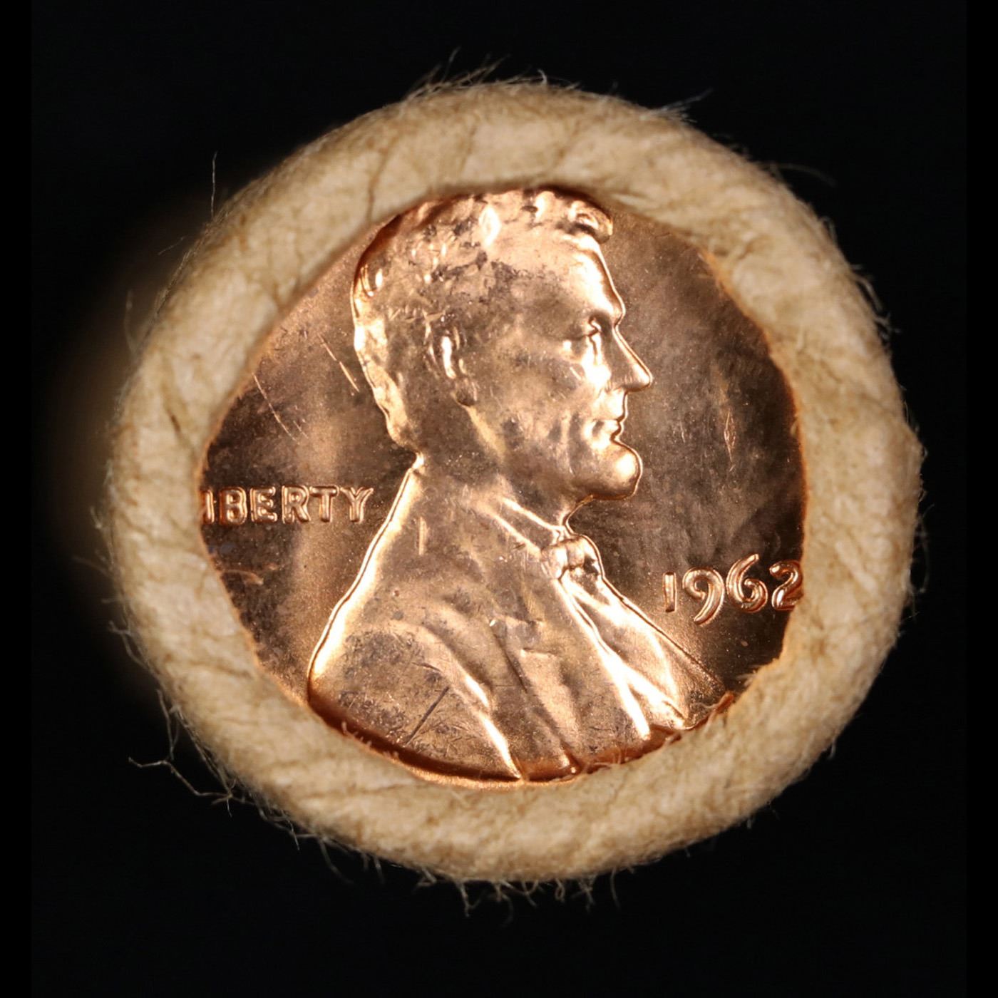 Shotgun Lincoln 1c roll, 1962-p 50 pcs Brandt Wrapper.. A terrific Shotgun roll of Lincoln cents. Most if not all coin should be cherry red. Trends ms65 rd $18