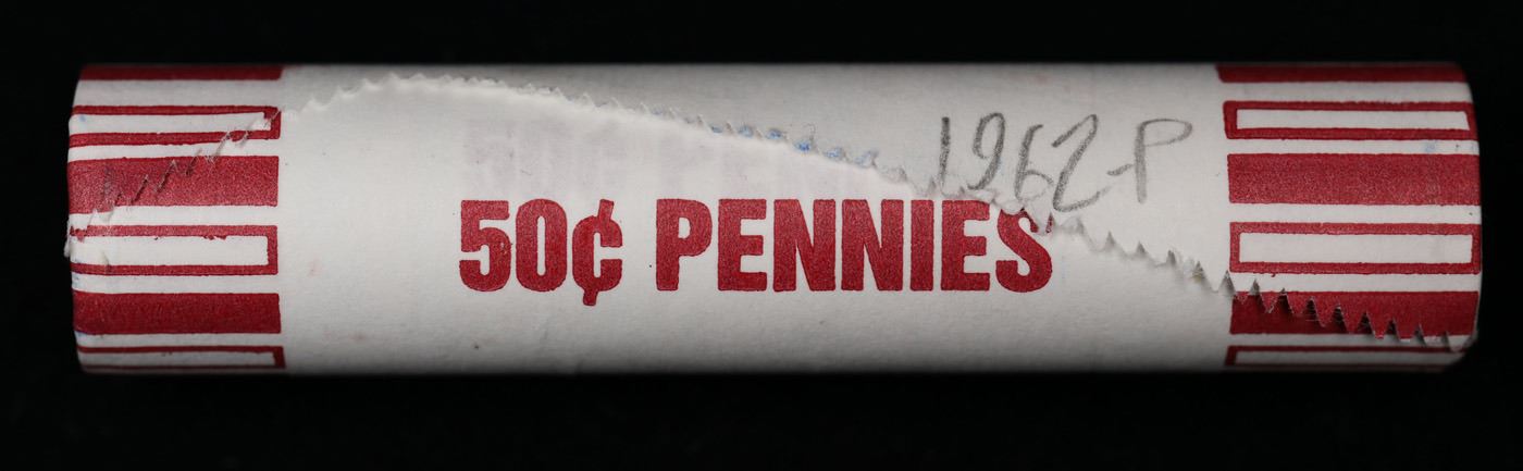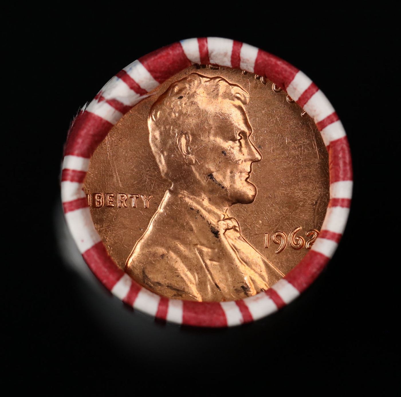 Shotgun Lincoln 1c roll, 1962-p 50 pcs Steel-Strong Wrapper.. A terrific Shotgun roll of Lincoln cents. Most if not all coin should be cherry red.