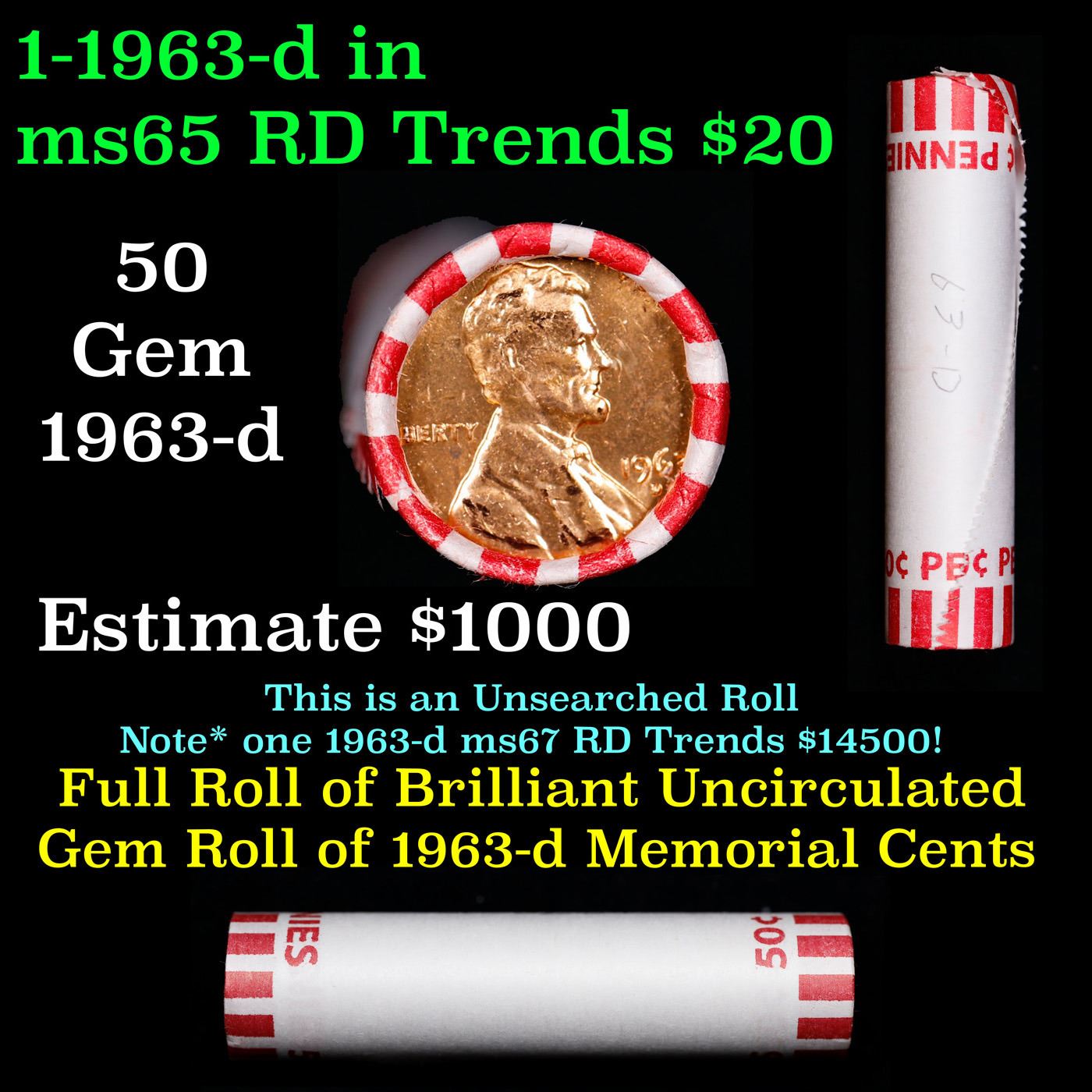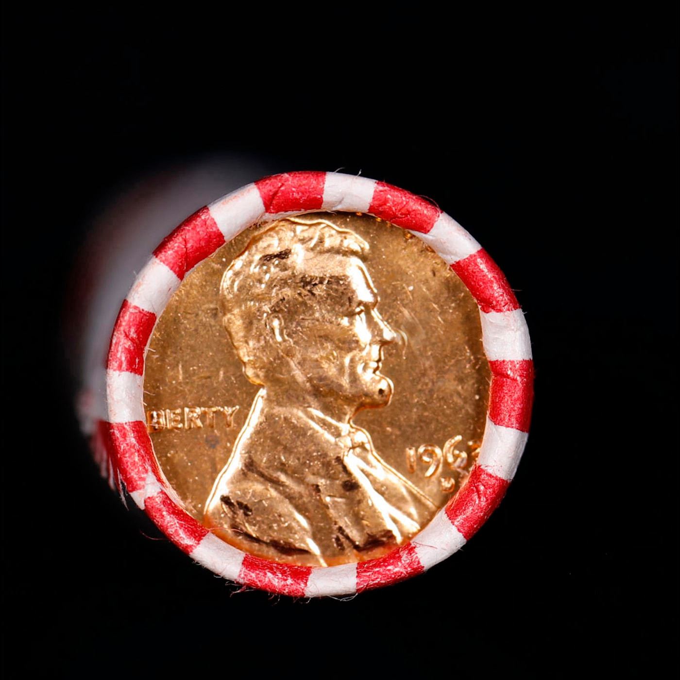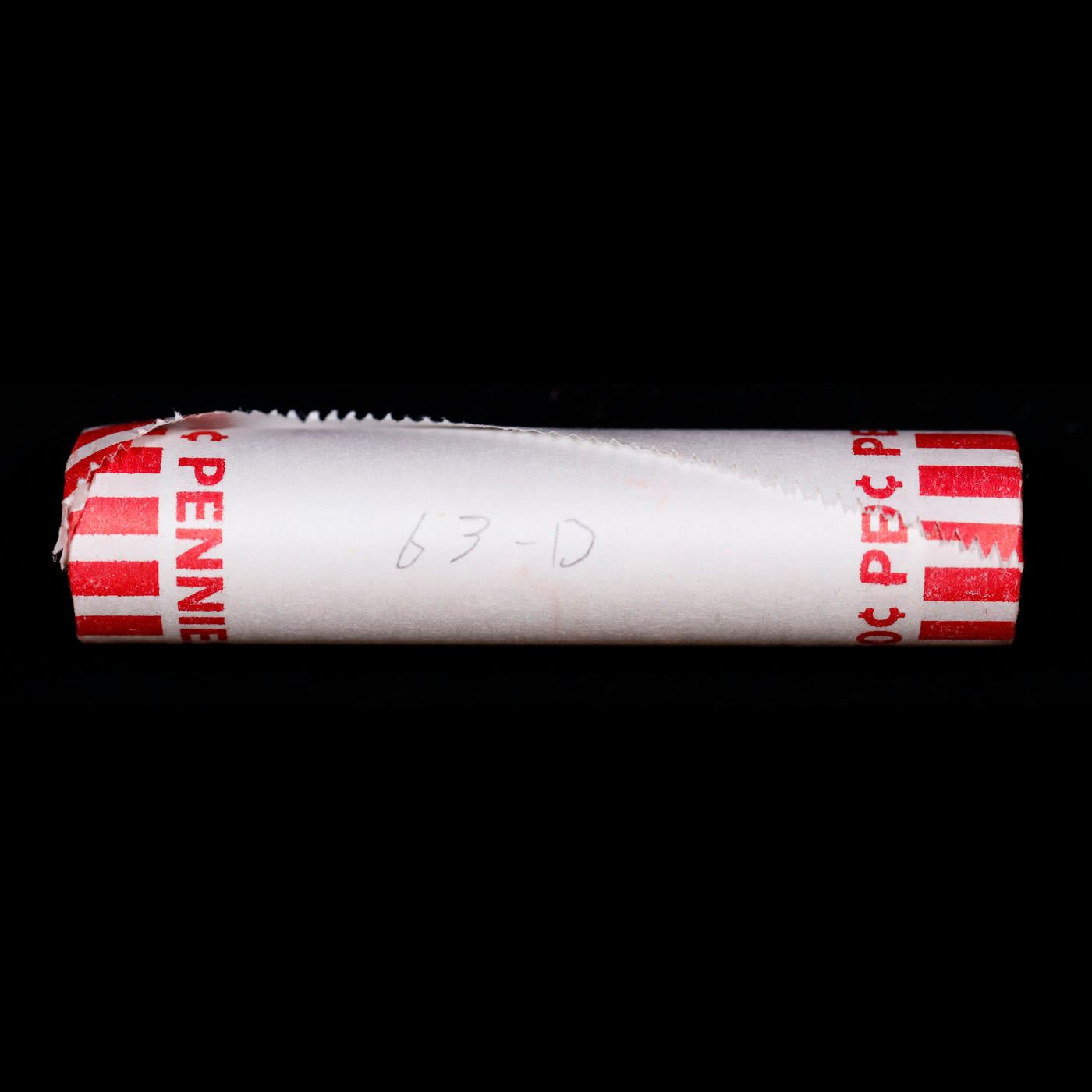 Shotgun Lincoln 1c roll, 1963-d 50 pcs Bank Wrapper.. A terrific Shotgun roll of Lincoln cents. Most if not all coin should be cherry red.
