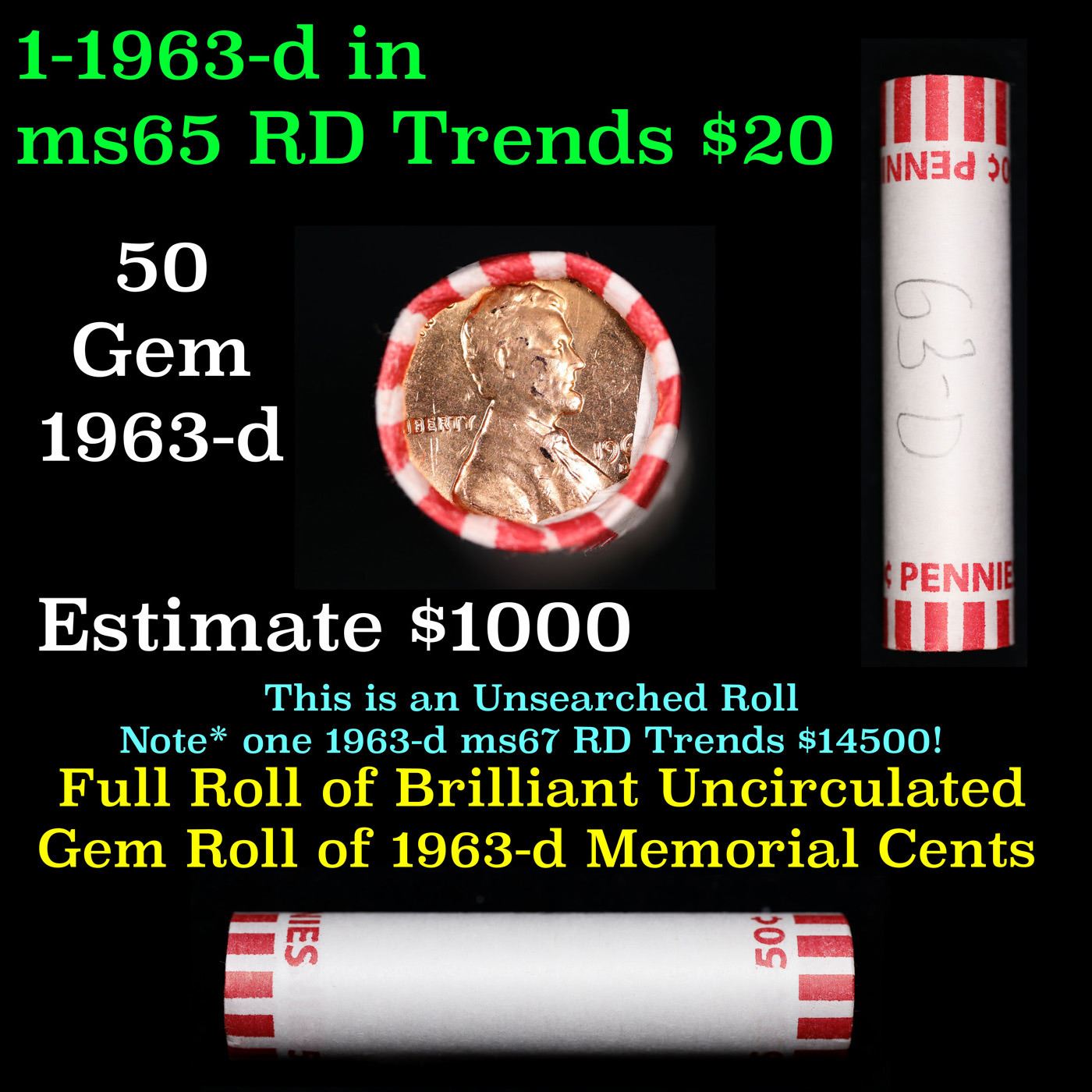 Shotgun Lincoln 1c roll, 1963-d 50 pcs Bank Wrapper.. A terrific Shotgun roll of Lincoln cents. Most if not all coin should be cherry red.