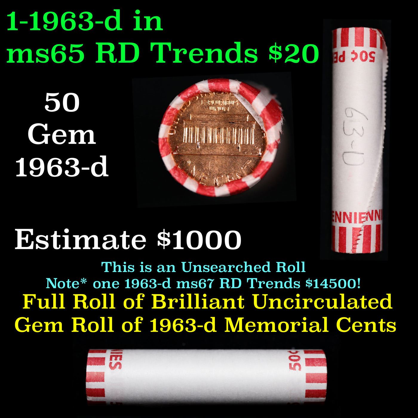 Shotgun Lincoln 1c roll, 1963-d 50 pcs Bank Wrapper.. A terrific Shotgun roll of Lincoln cents. Most if not all coin should be cherry red.