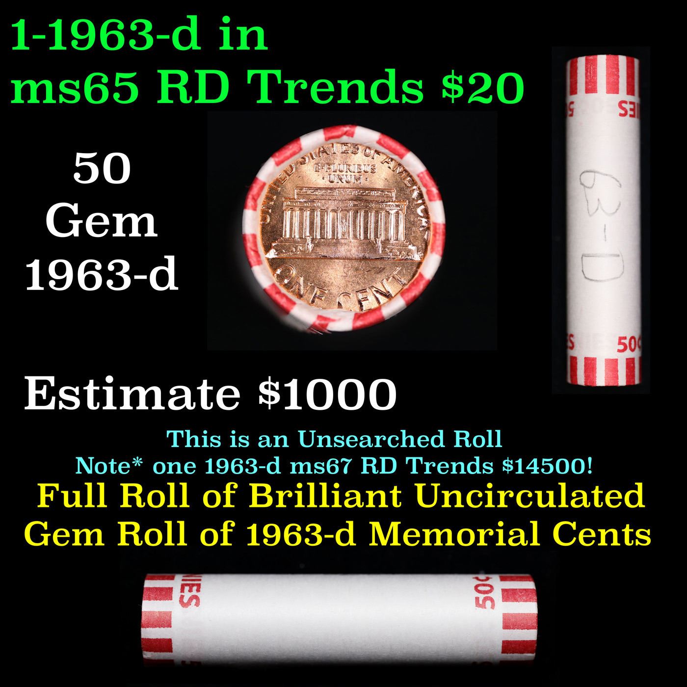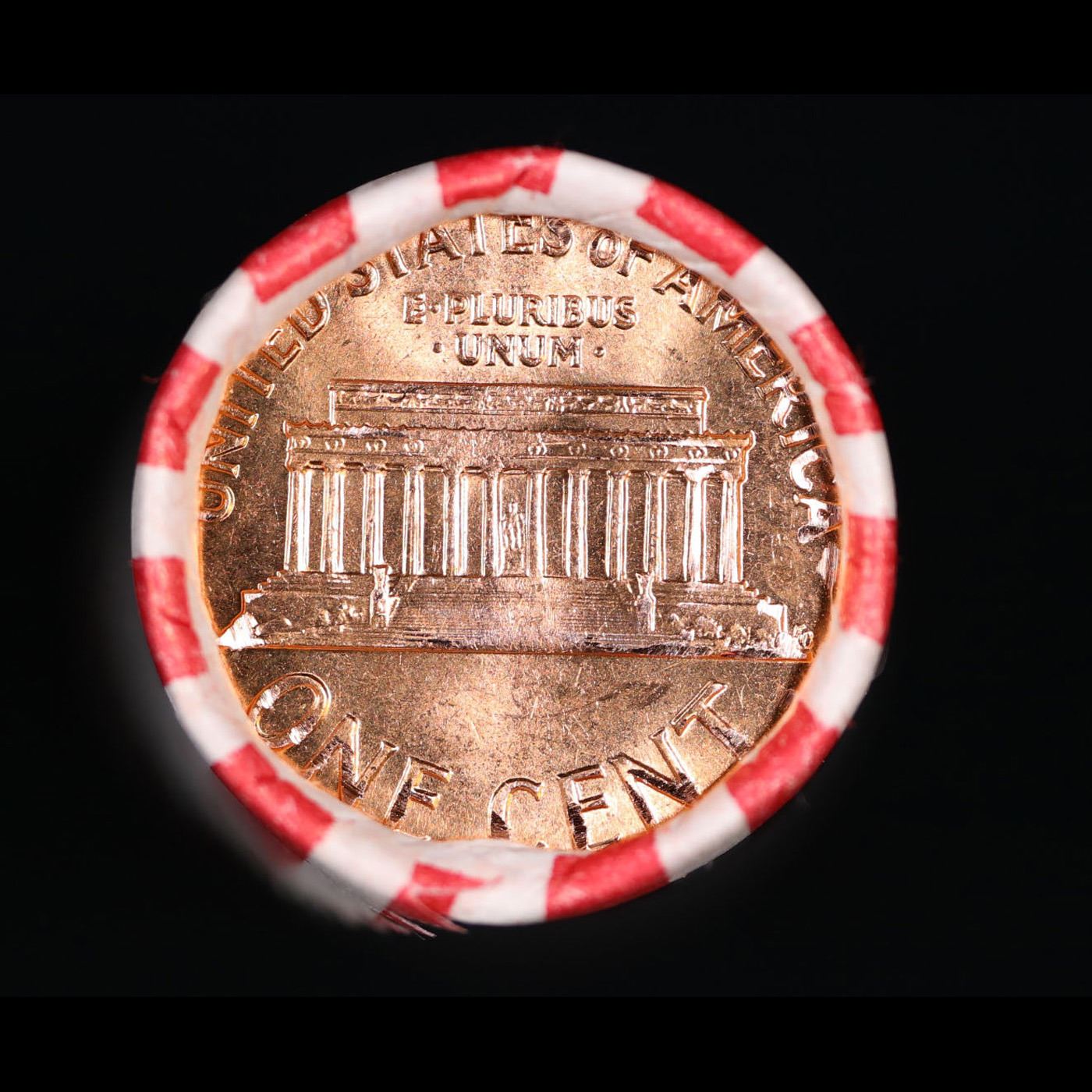 Shotgun Lincoln 1c roll, 1963-d 50 pcs Bank Wrapper.. A terrific Shotgun roll of Lincoln cents. Most if not all coin should be cherry red.