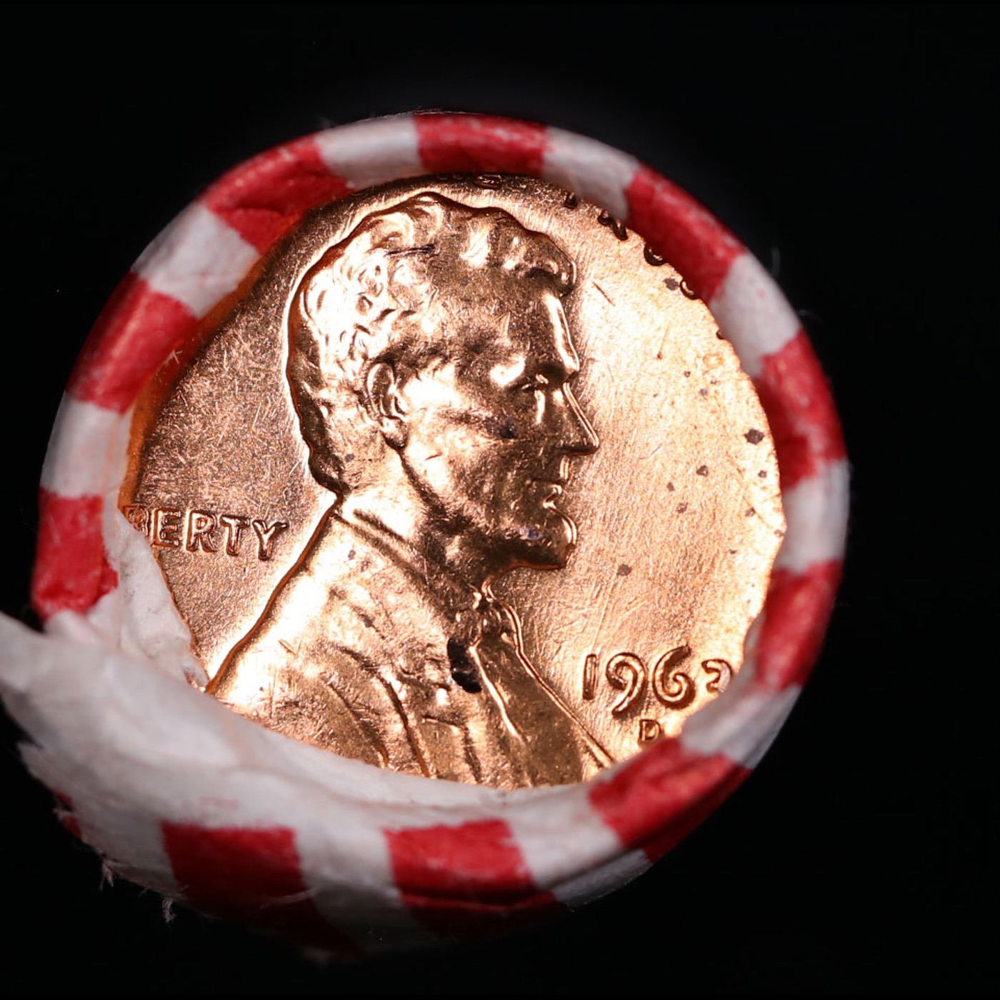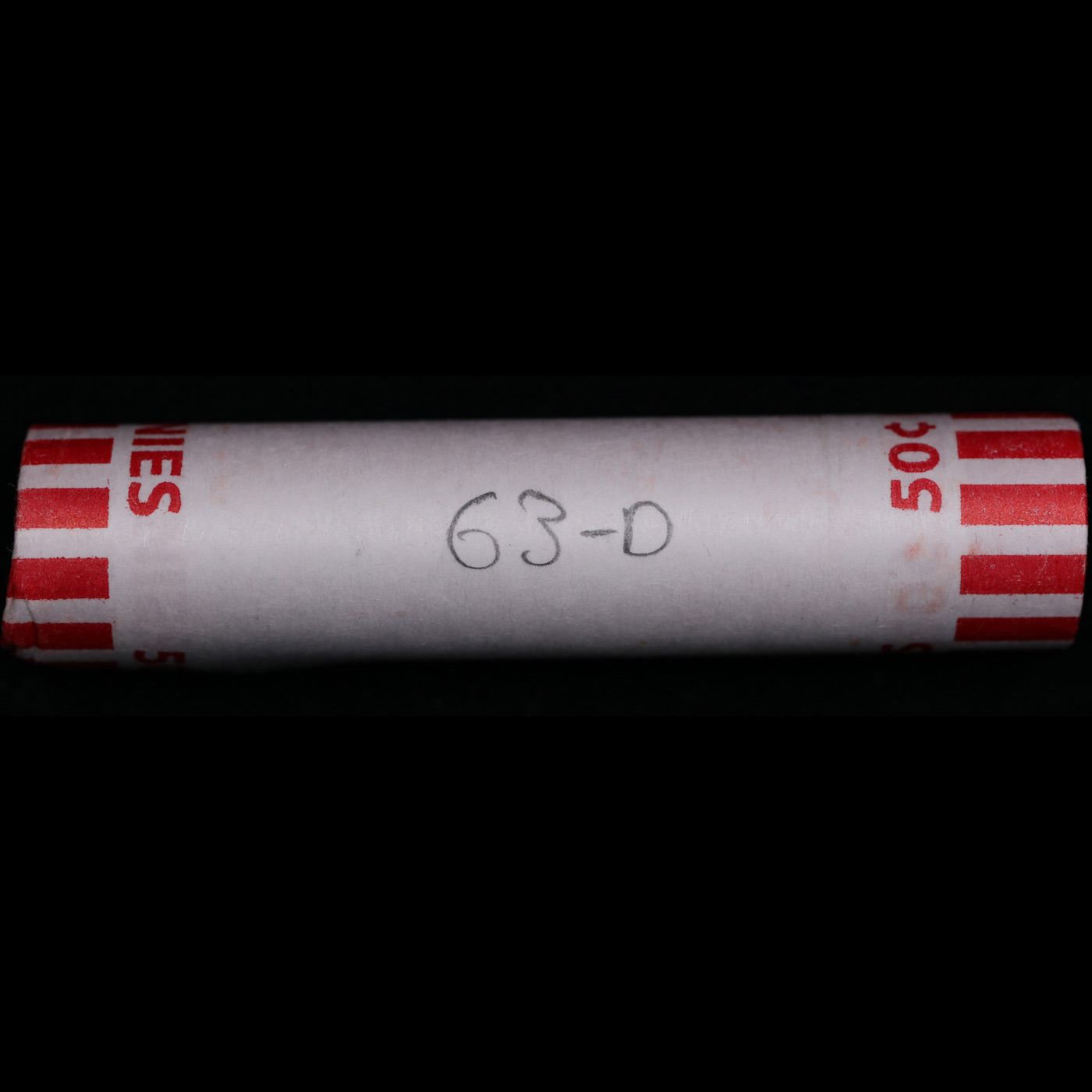 Shotgun Lincoln 1c roll, 1963-d 50 pcs Bank Wrapper.. A terrific Shotgun roll of Lincoln cents. Most if not all coin should be cherry red.