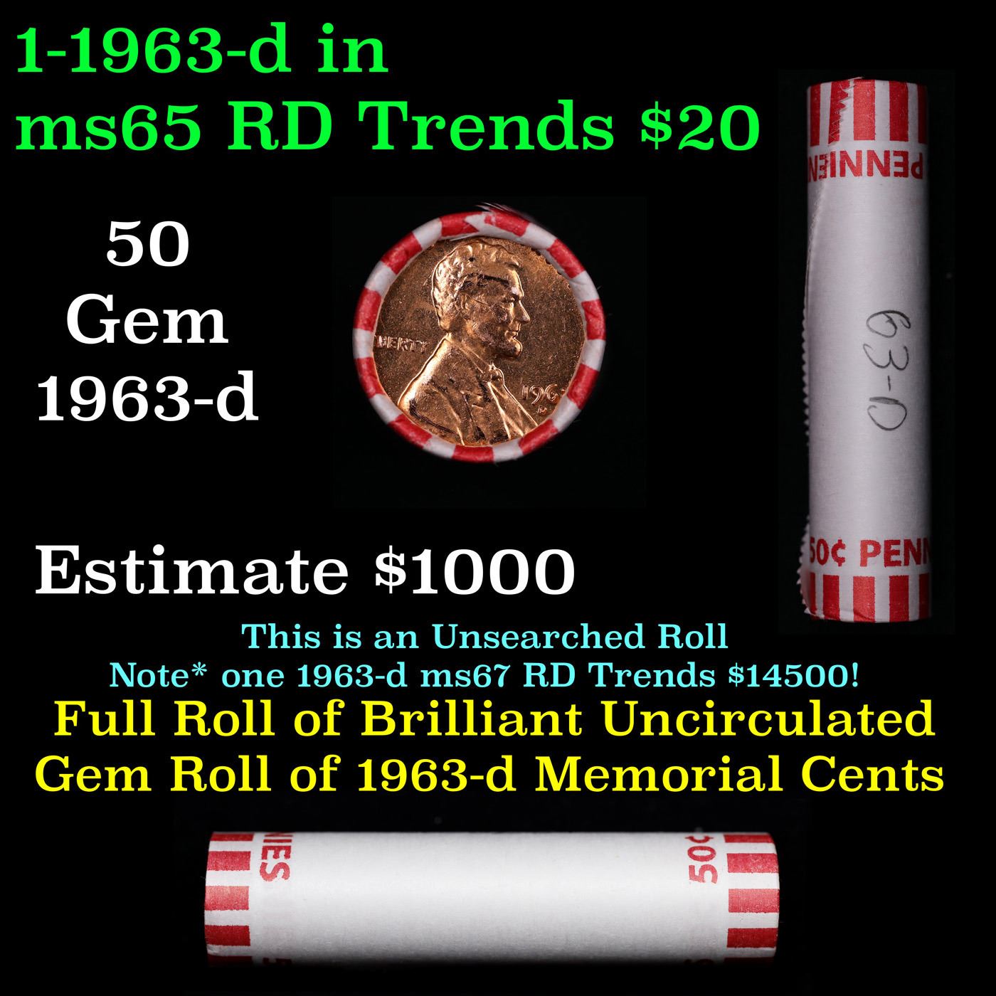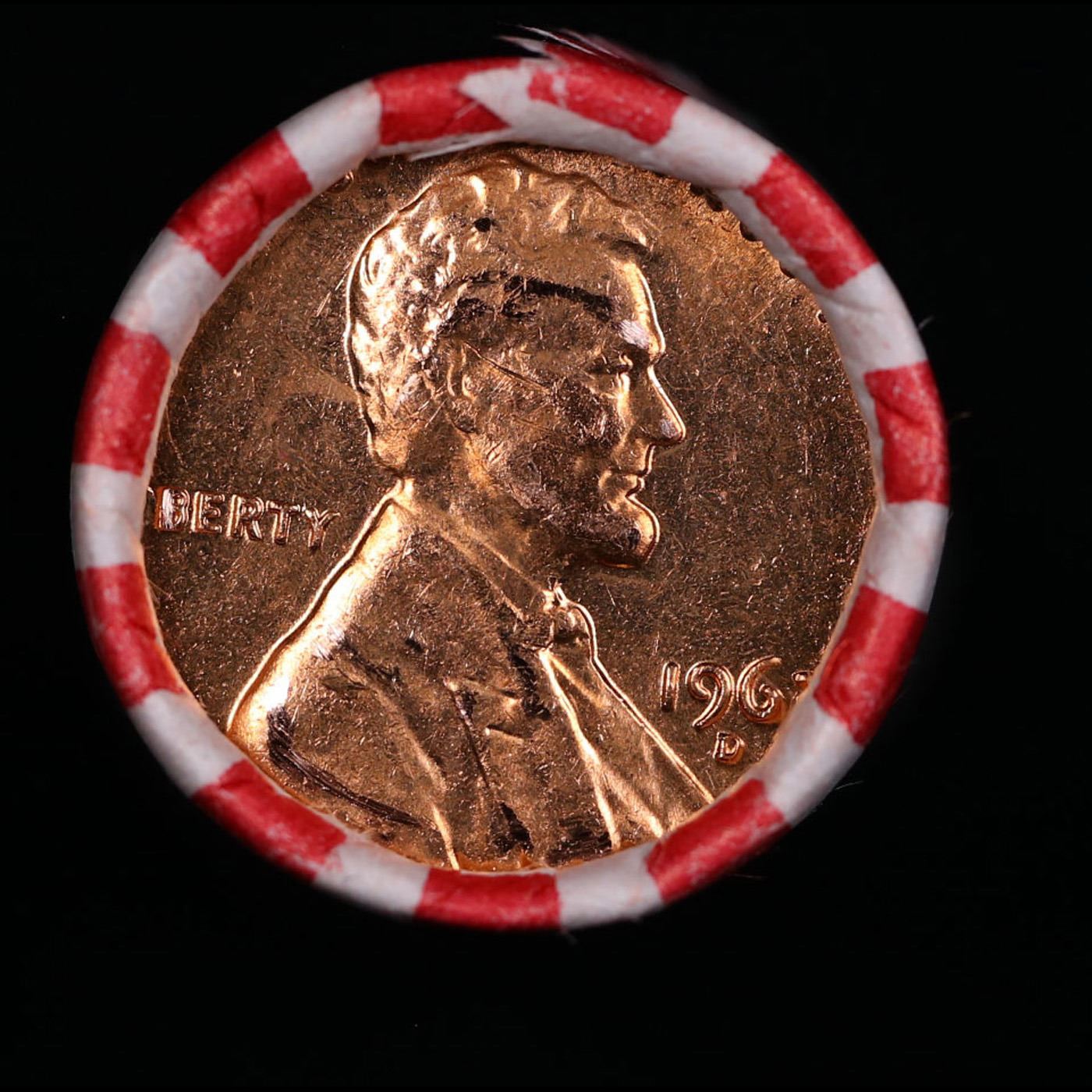 Shotgun Lincoln 1c roll, 1963-d 50 pcs Bank Wrapper.. A terrific Shotgun roll of Lincoln cents. Most if not all coin should be cherry red.
