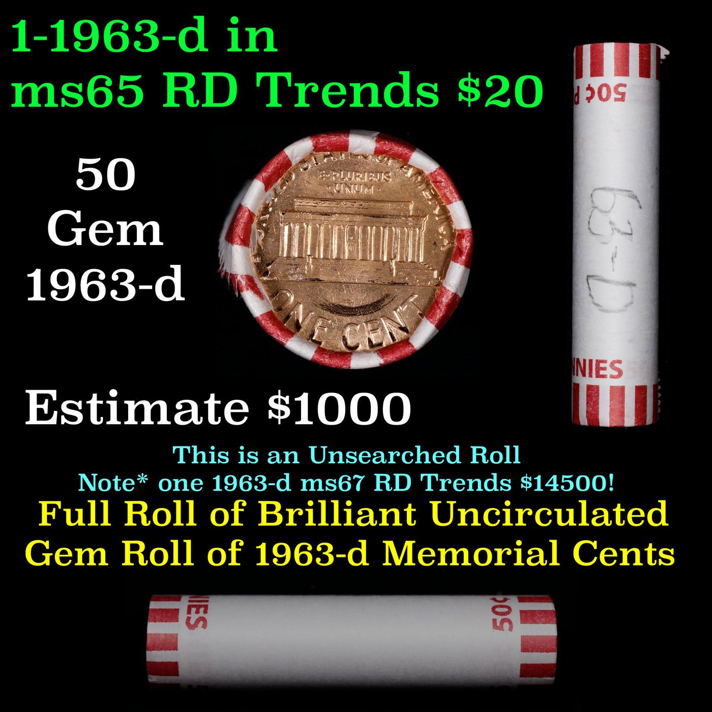 Shotgun Lincoln 1c roll, 1963-d 50 pcs Bank Wrapper.. A terrific Shotgun roll of Lincoln cents. Most if not all coin should be cherry red.