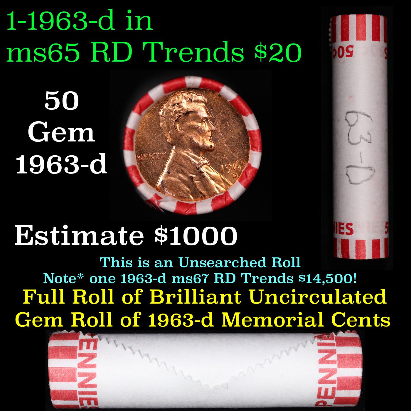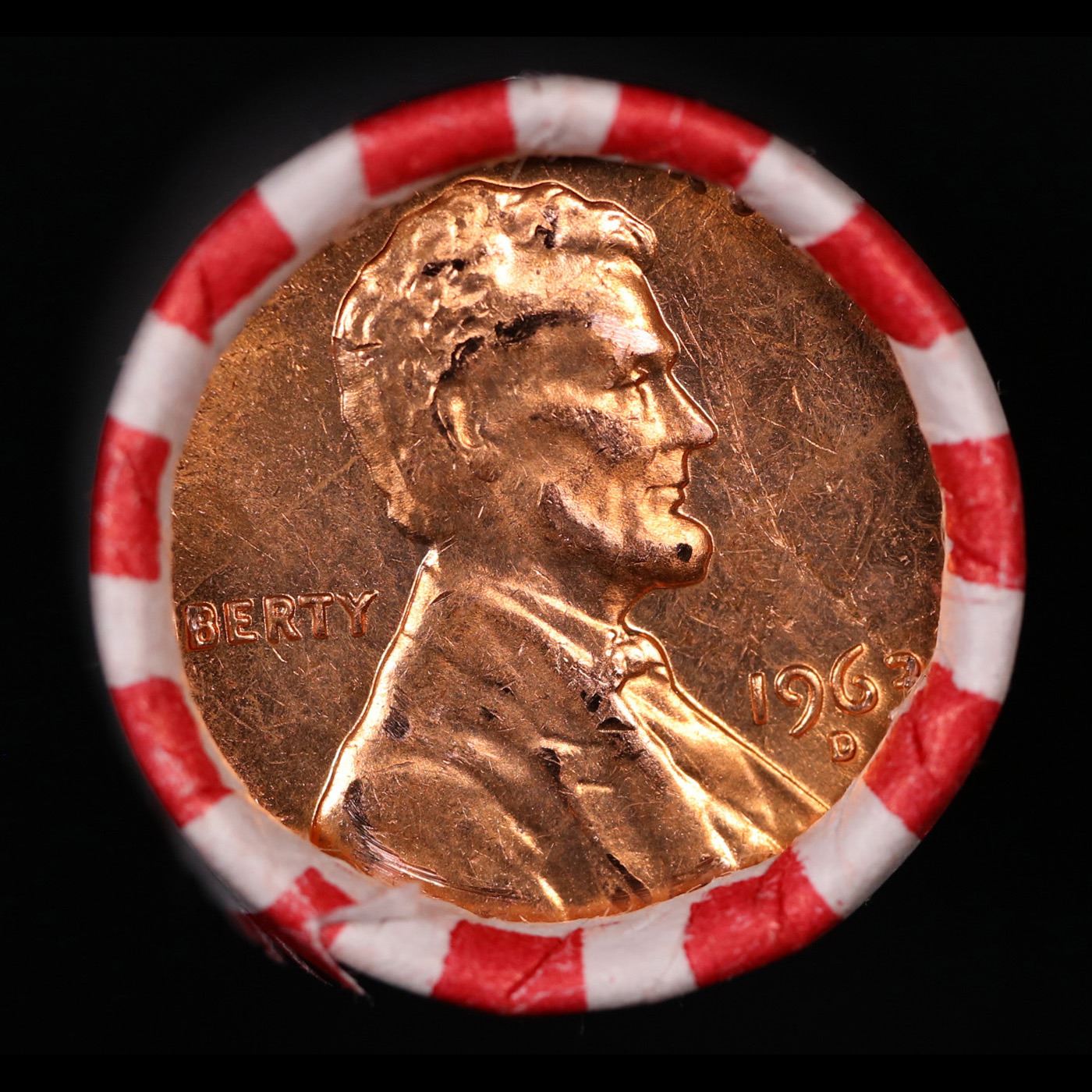 Shotgun Lincoln 1c roll, 1963-d 50 pcs Bank Wrapper.. A terrific Shotgun roll of Lincoln cents. Most if not all coin should be cherry red.