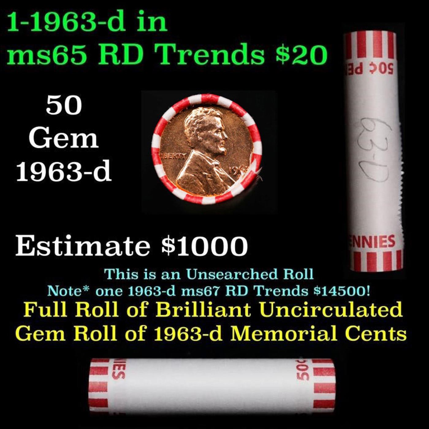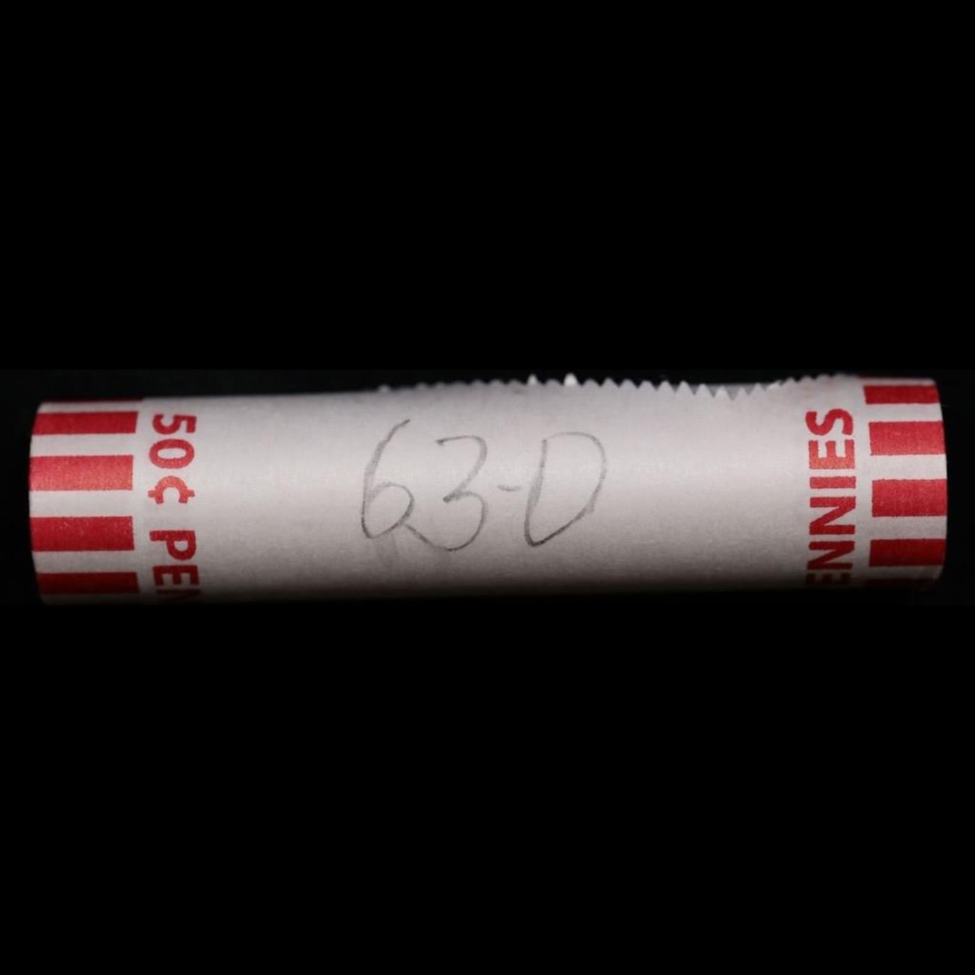 Shotgun Lincoln 1c roll, 1963-d 50 pcs Bank Wrapper.. A terrific Shotgun roll of Lincoln cents. Most if not all coin should be cherry red.