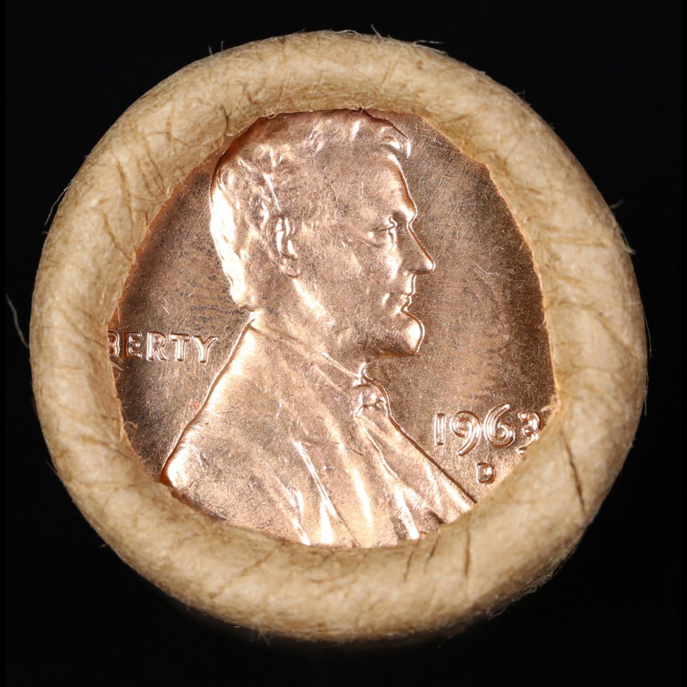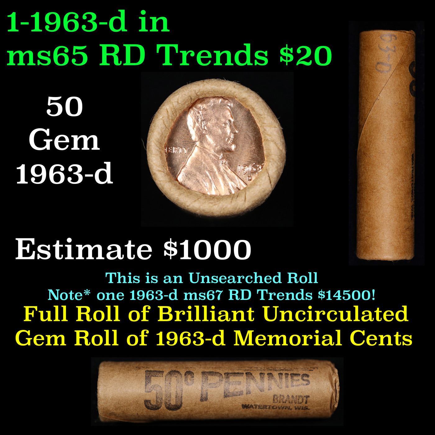 Shotgun Lincoln 1c roll, 1963-d 50 pcs Brandt Wrapper.. A terrific Shotgun roll of Lincoln cents. Most if not all coin should be cherry red. Trends ms65 rd $20