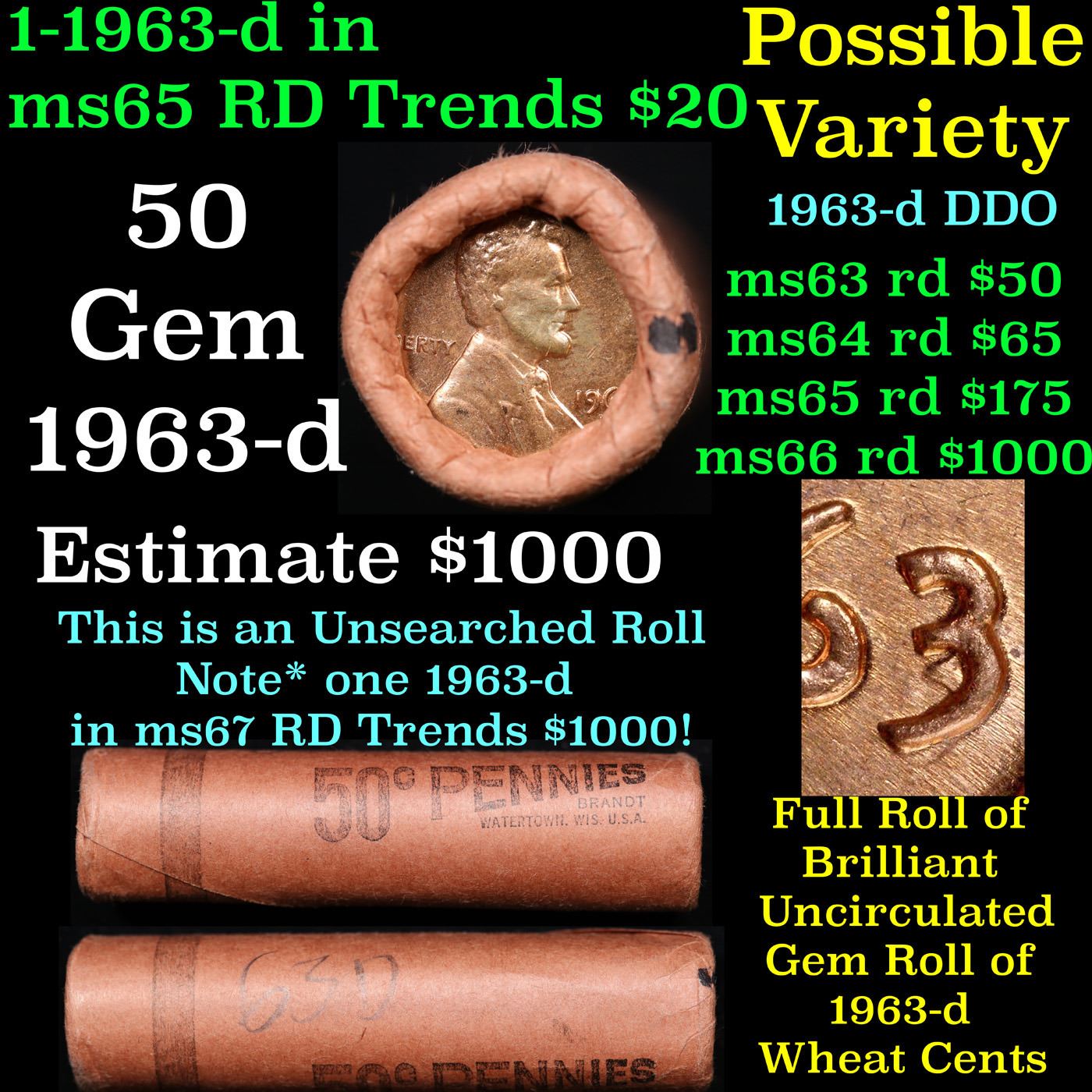 Shotgun Lincoln 1c roll, 1963-d 50 pcs Brandt Wrapper.. A terrific Shotgun roll of Lincoln cents. Most if not all coin should be cherry red.