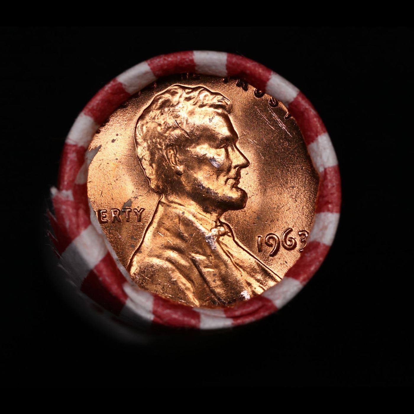 Shotgun Lincoln 1c roll, 1963-p 50 pcs Bank Wrapper.. A terrific Shotgun roll of Lincoln cents. Most if not all coin should be cherry red.