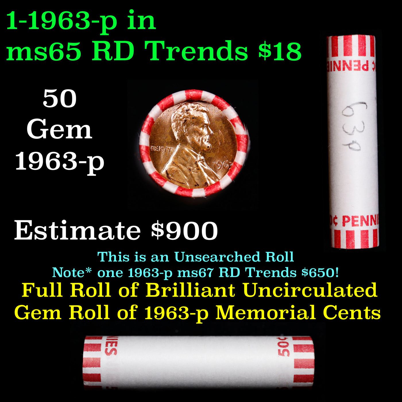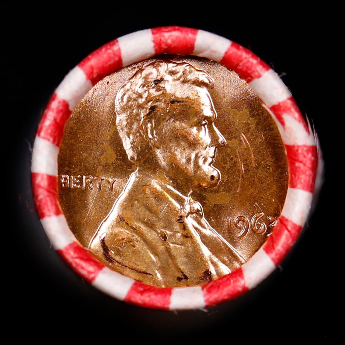 Shotgun Lincoln 1c roll, 1963-p 50 pcs Bank Wrapper.. A terrific Shotgun roll of Lincoln cents. Most if not all coin should be cherry red.