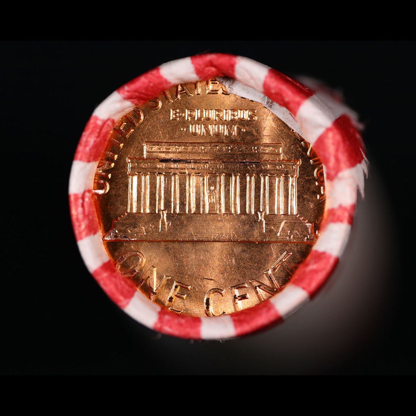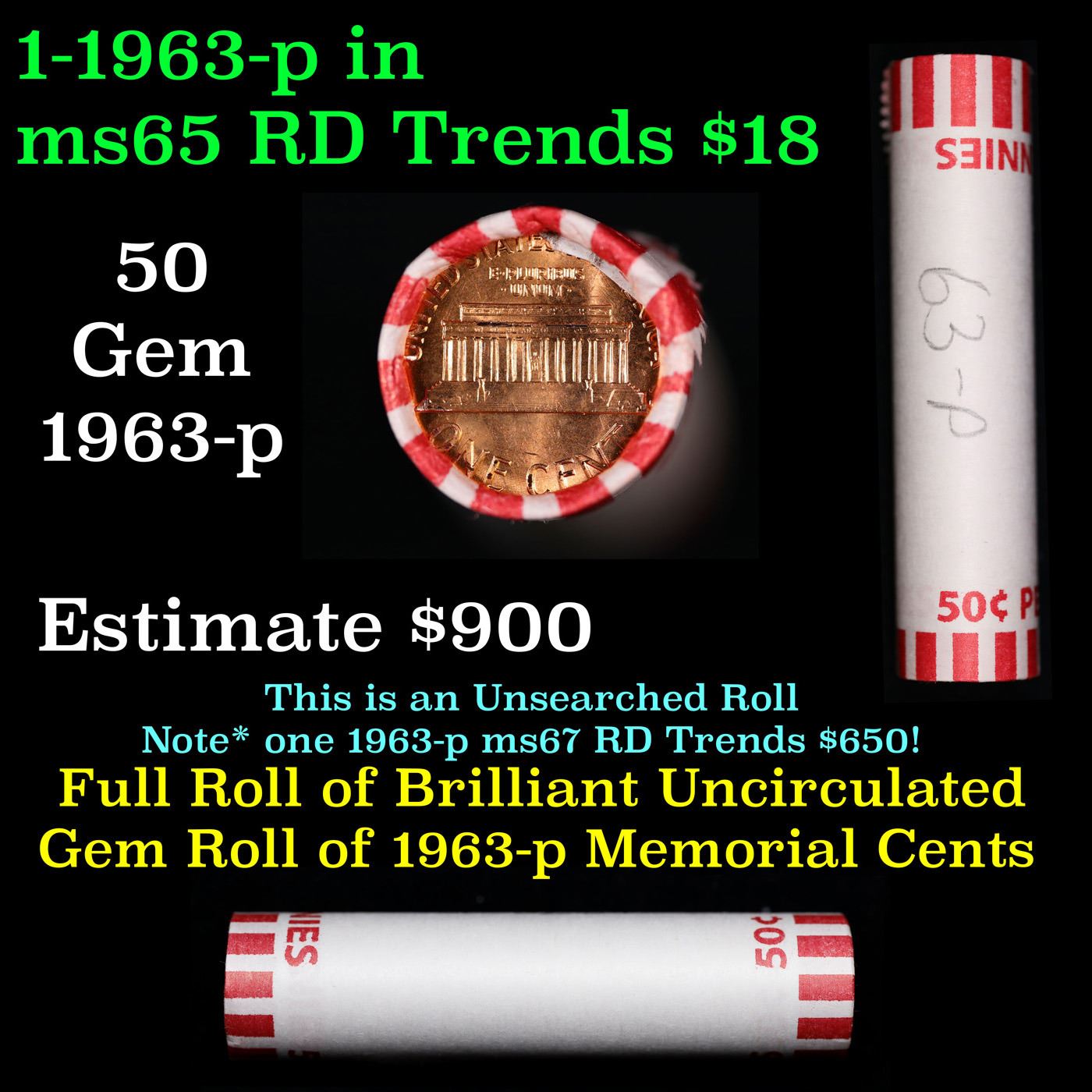 Shotgun Lincoln 1c roll, 1963-p 50 pcs Bank Wrapper.. A terrific Shotgun roll of Lincoln cents. Most if not all coin should be cherry red.