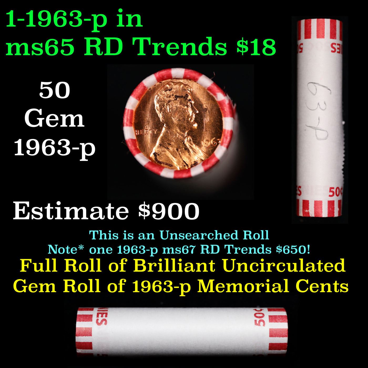 Shotgun Lincoln 1c roll, 1963-p 50 pcs Bank Wrapper.. A terrific Shotgun roll of Lincoln cents. Most if not all coin should be cherry red.