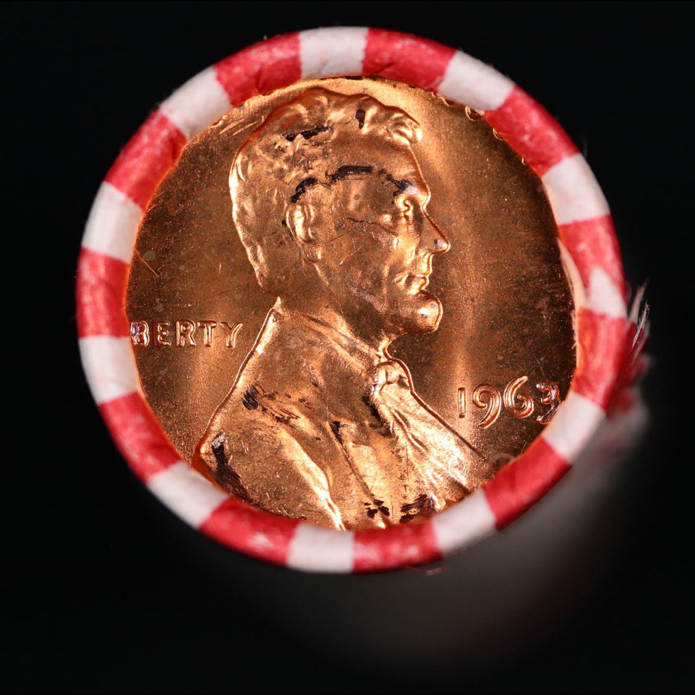 Shotgun Lincoln 1c roll, 1963-p 50 pcs Bank Wrapper.. A terrific Shotgun roll of Lincoln cents. Most if not all coin should be cherry red.