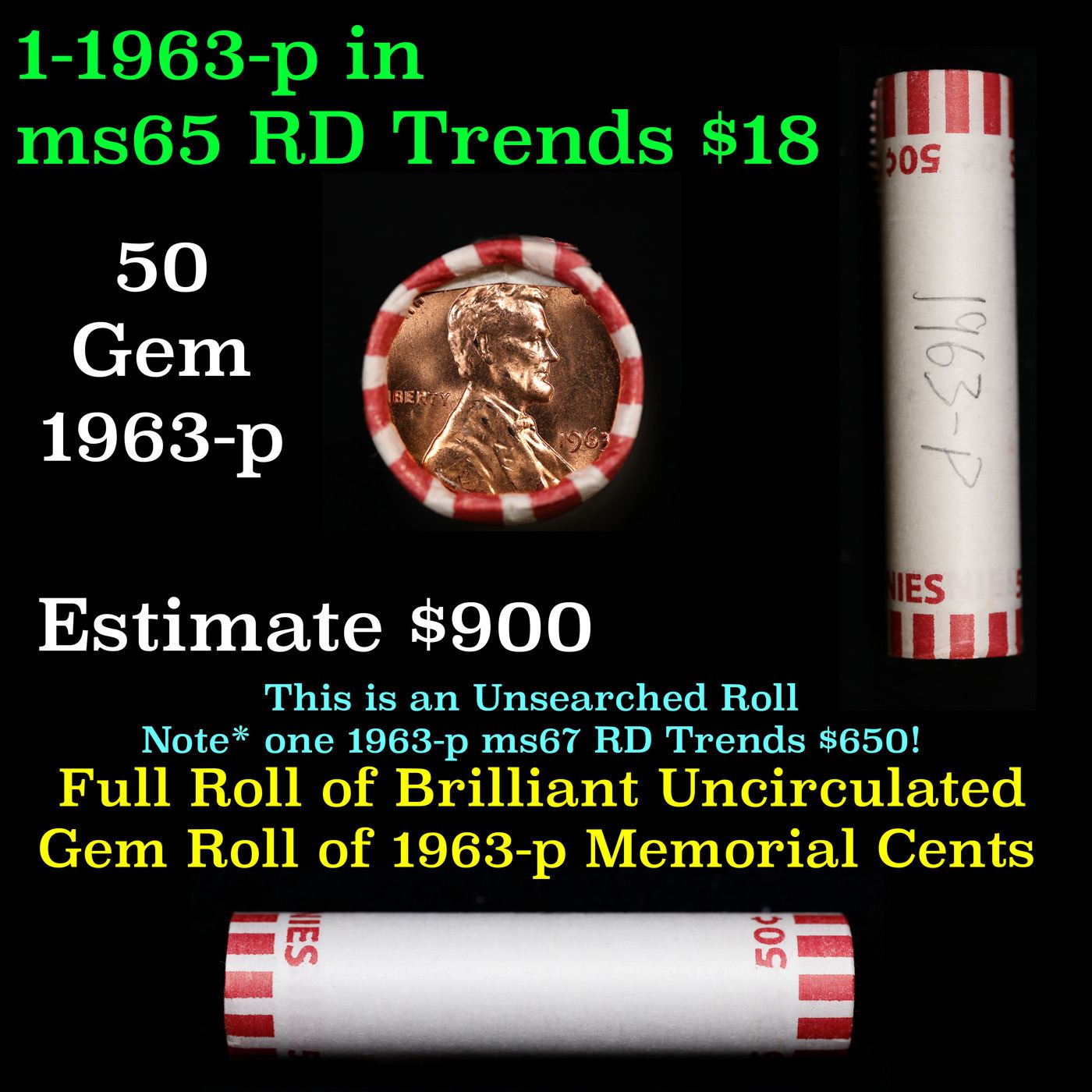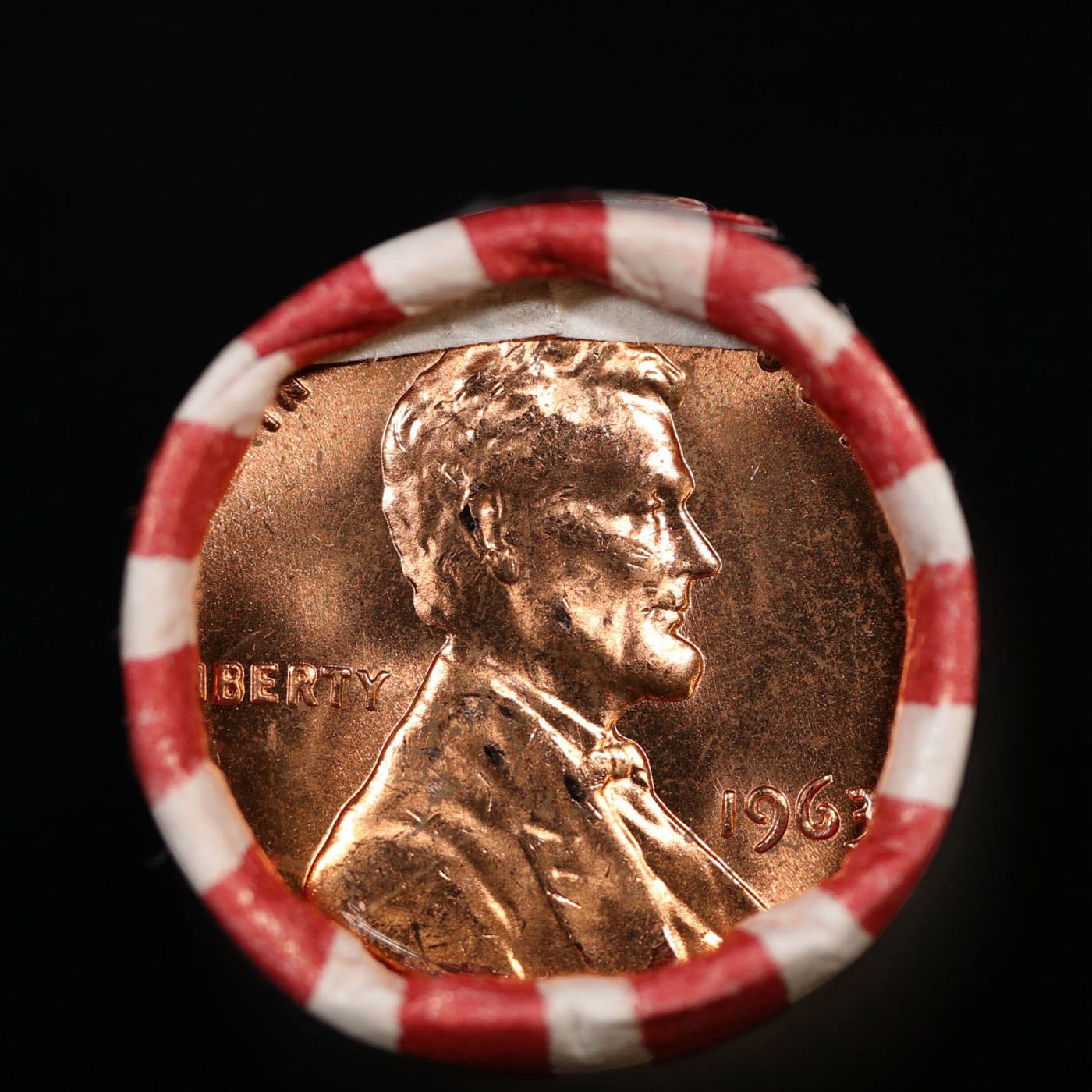 Shotgun Lincoln 1c roll, 1963-p 50 pcs Bank Wrapper.. A terrific Shotgun roll of Lincoln cents. Most if not all coin should be cherry red.