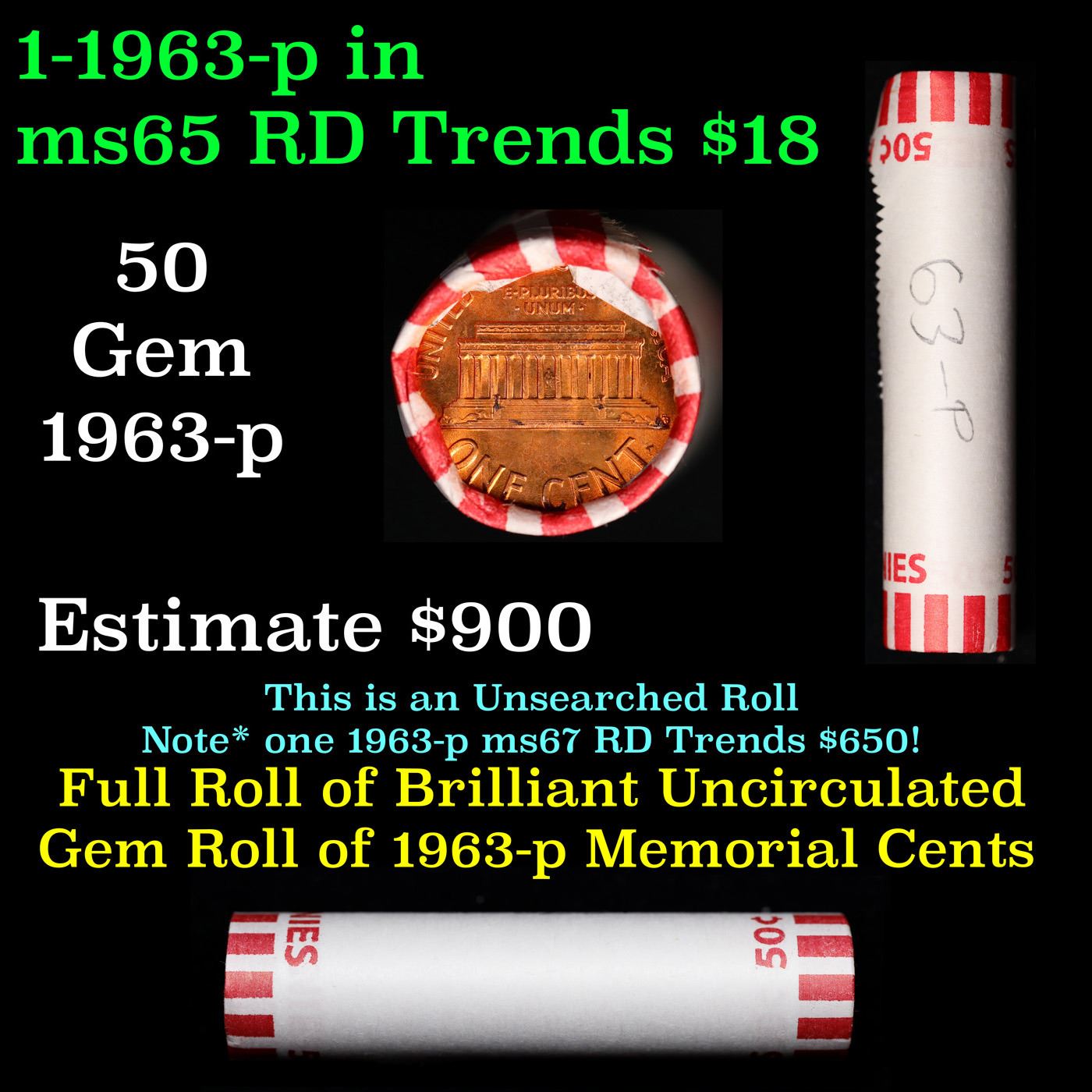 Shotgun Lincoln 1c roll, 1963-p 50 pcs Bank Wrapper.. A terrific Shotgun roll of Lincoln cents. Most if not all coin should be cherry red.