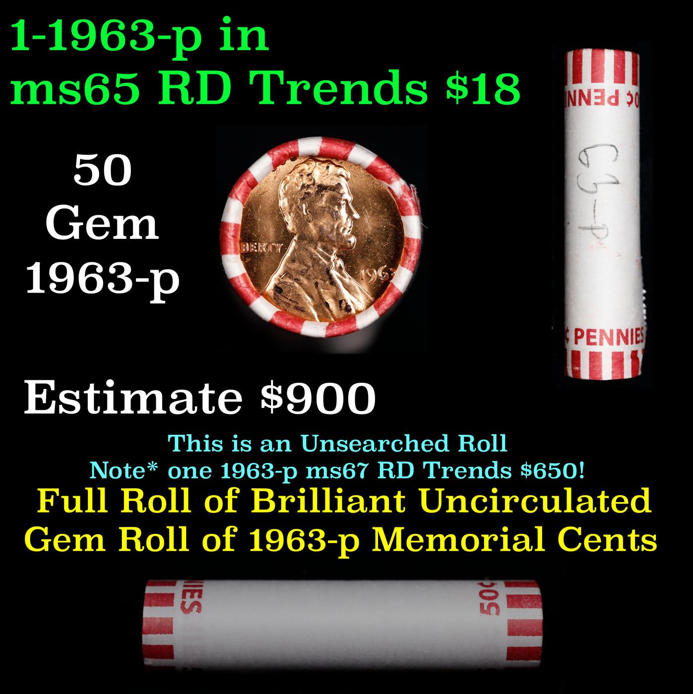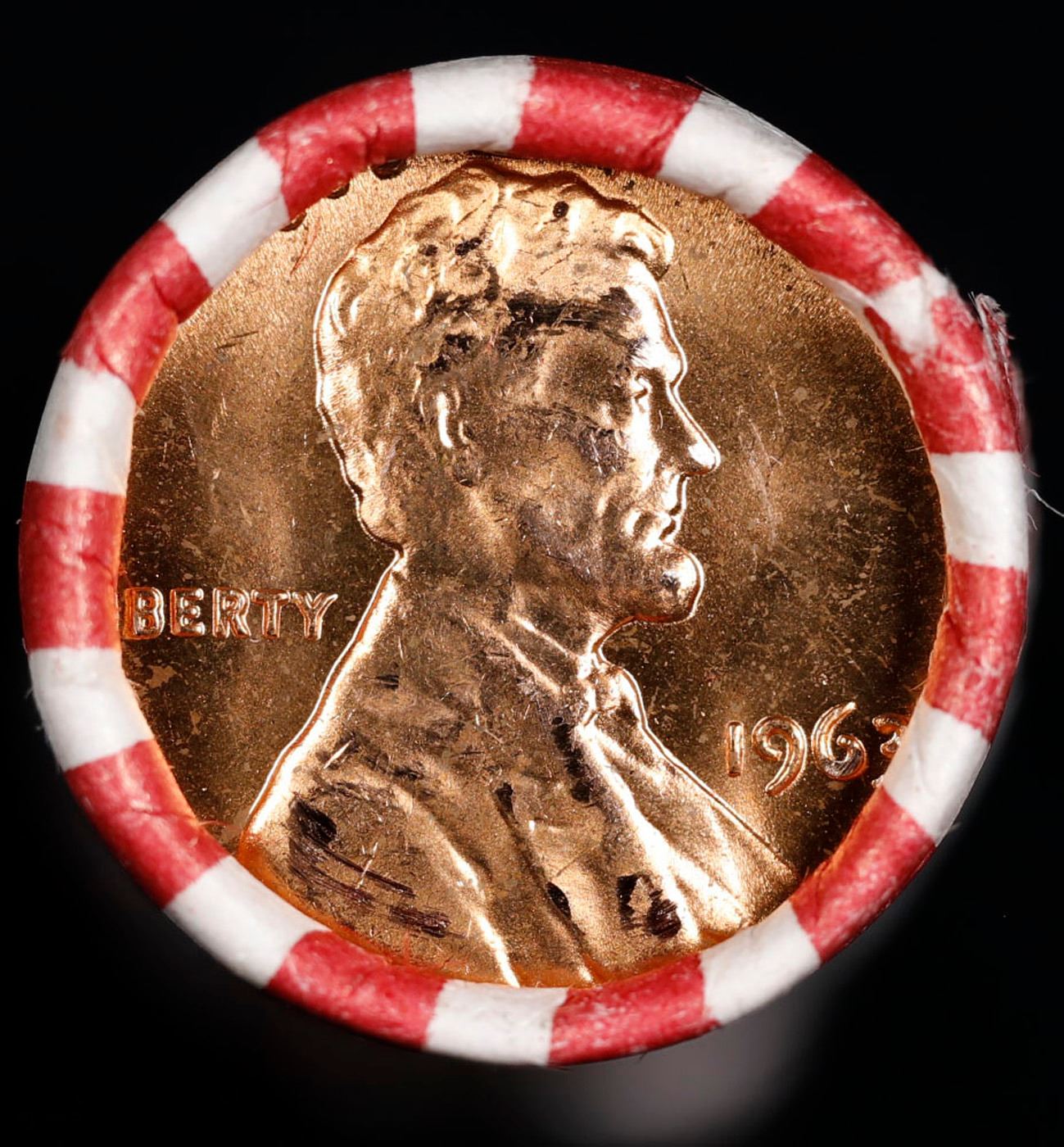 Shotgun Lincoln 1c roll, 1963-p 50 pcs Bank Wrapper.. A terrific Shotgun roll of Lincoln cents. Most if not all coin should be cherry red.