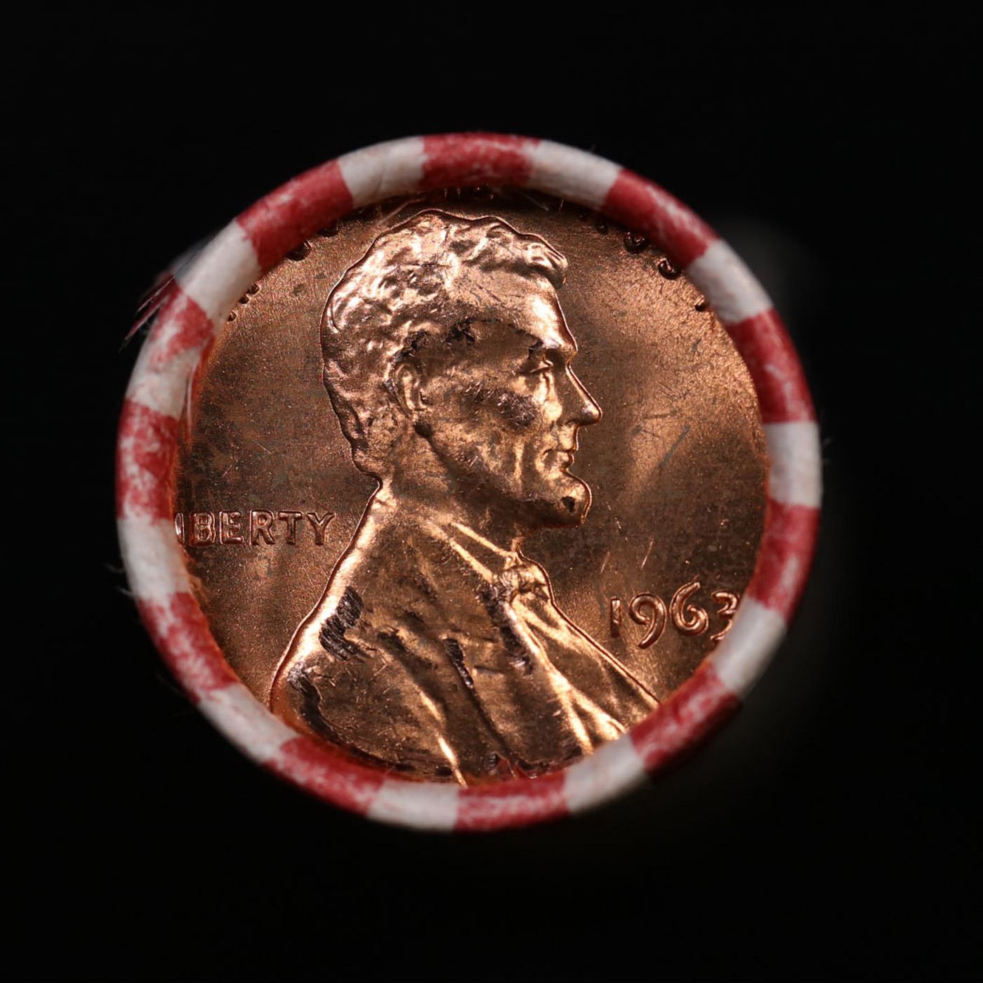 Shotgun Lincoln 1c roll, 1963-p 50 pcs Bank Wrapper.. A terrific Shotgun roll of Lincoln cents. Most if not all coin should be cherry red.