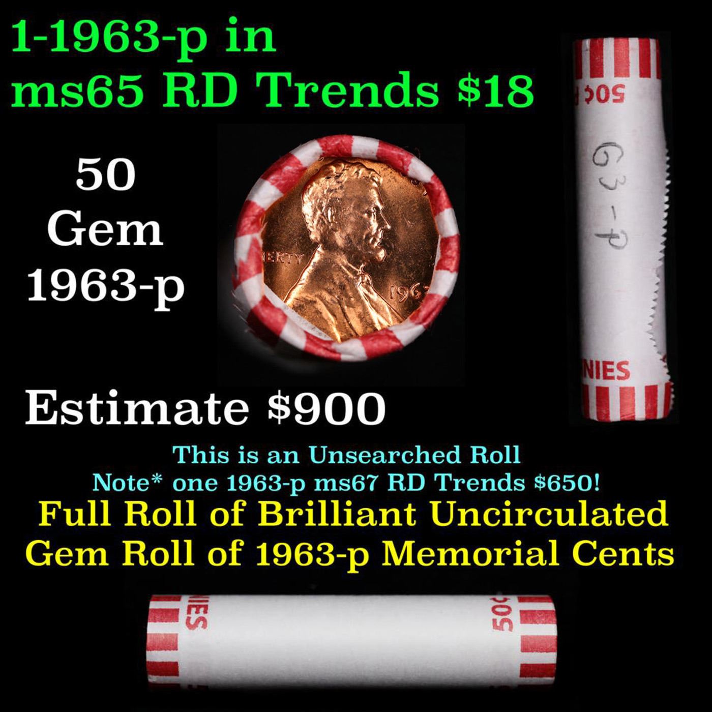 Shotgun Lincoln 1c roll, 1963-p 50 pcs Bank Wrapper.. A terrific Shotgun roll of Lincoln cents. Most if not all coin should be cherry red.