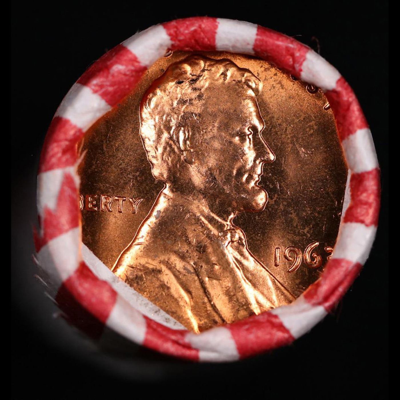 Shotgun Lincoln 1c roll, 1963-p 50 pcs Bank Wrapper.. A terrific Shotgun roll of Lincoln cents. Most if not all coin should be cherry red.