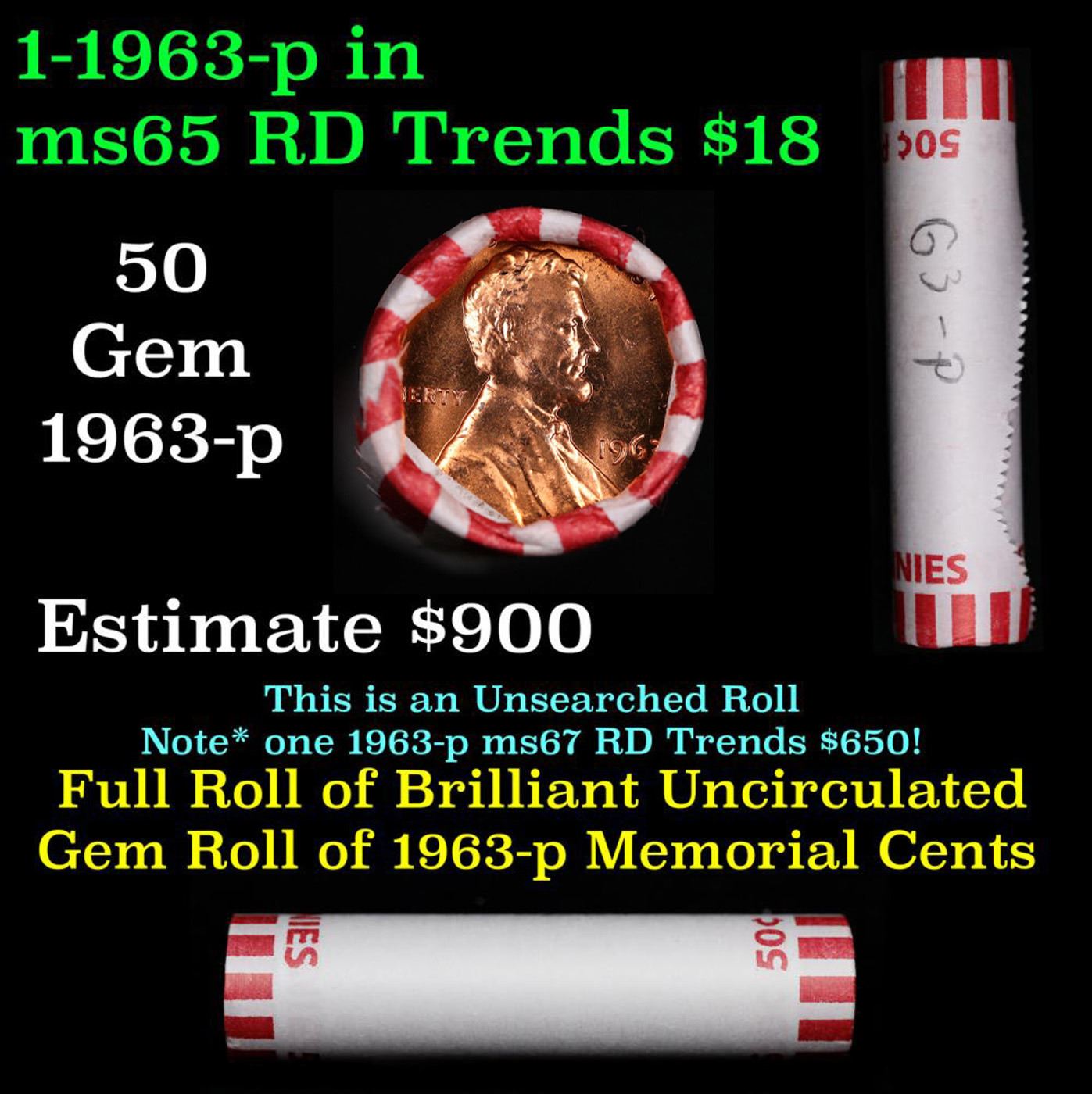 Shotgun Lincoln 1c roll, 1963-p 50 pcs Bank Wrapper.. A terrific Shotgun roll of Lincoln cents. Most if not all coin should be cherry red.