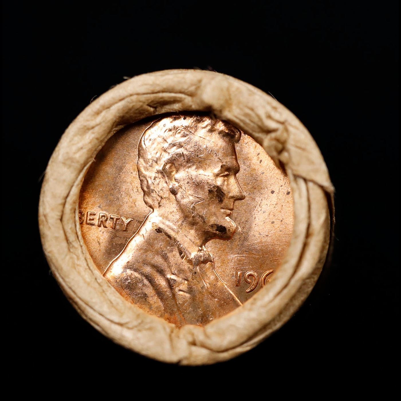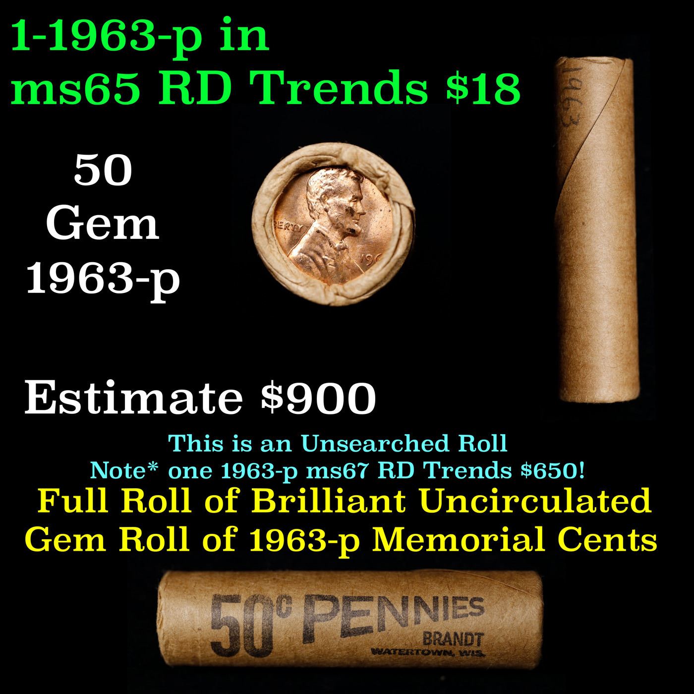Shotgun Lincoln 1c roll, 1963-p 50 pcs Brandt Wrapper . A terrific Shotgun roll of Lincoln cents. All coins appear to be cherry red. Trends ms65 rd $16