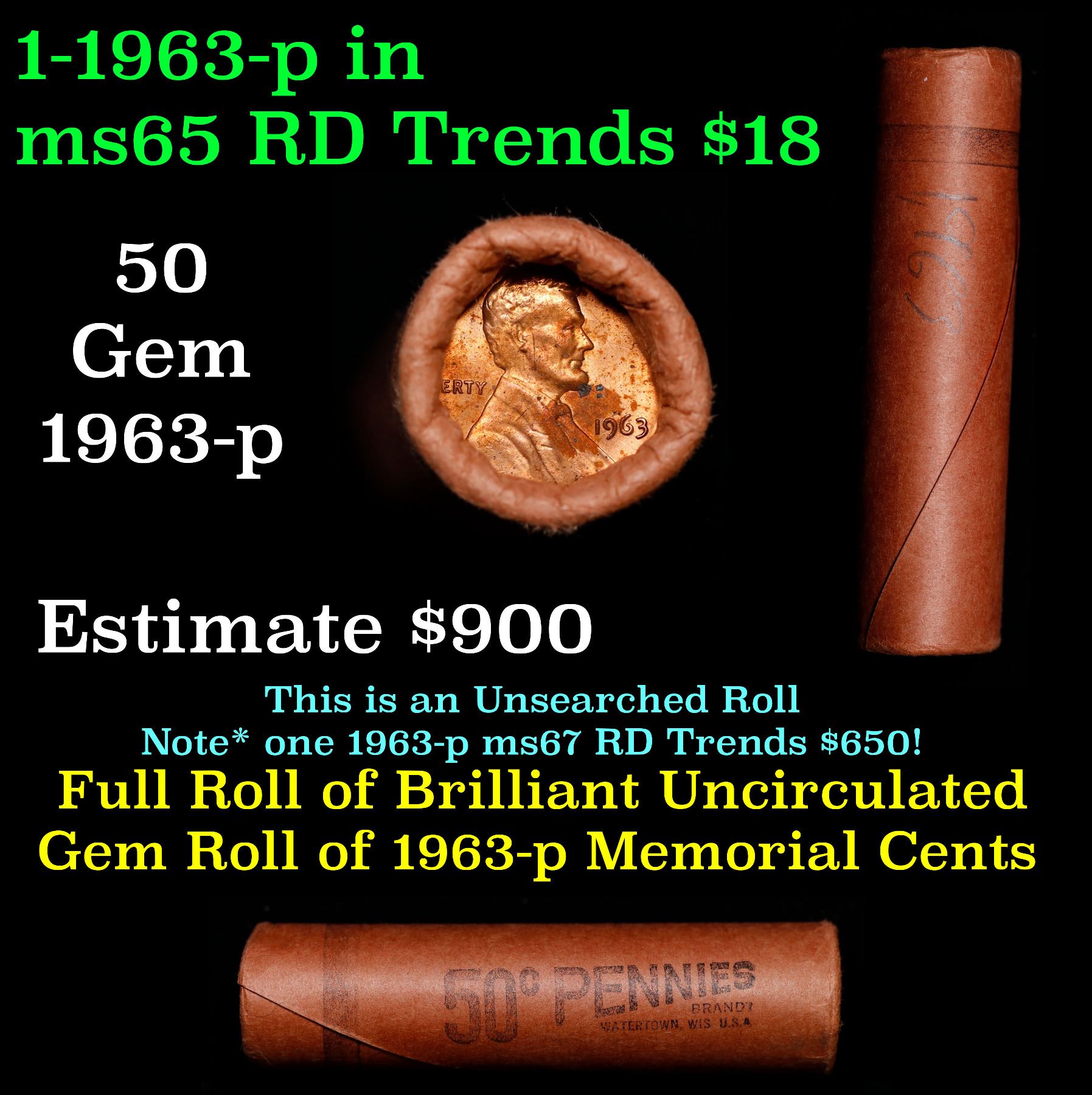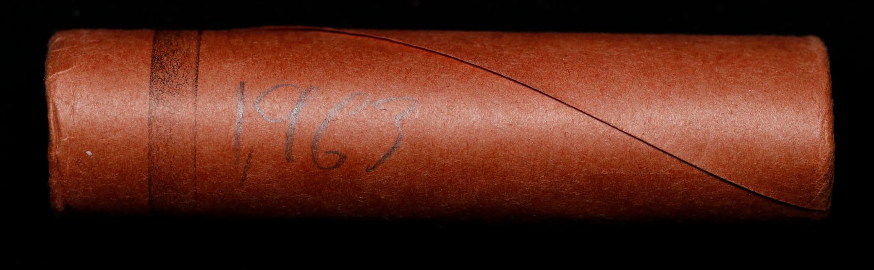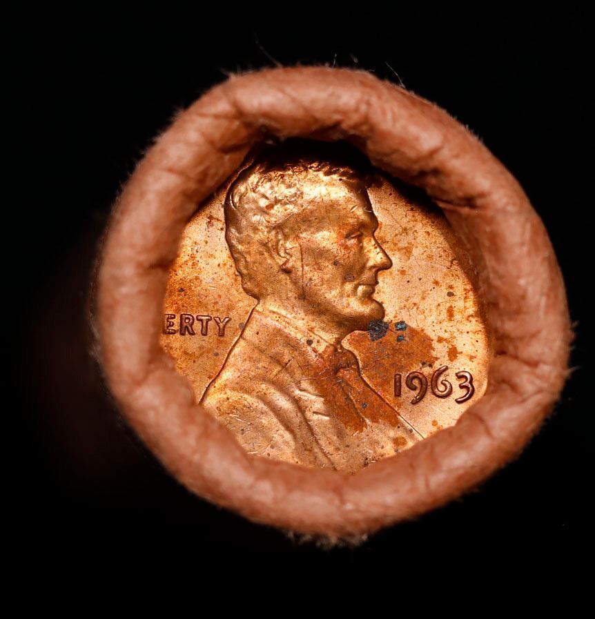 Shotgun Lincoln 1c roll, 1963-p 50 pcs Brandt Wrapper.. A terrific Shotgun roll of Lincoln cents. Most if not all coin should be cherry red.
